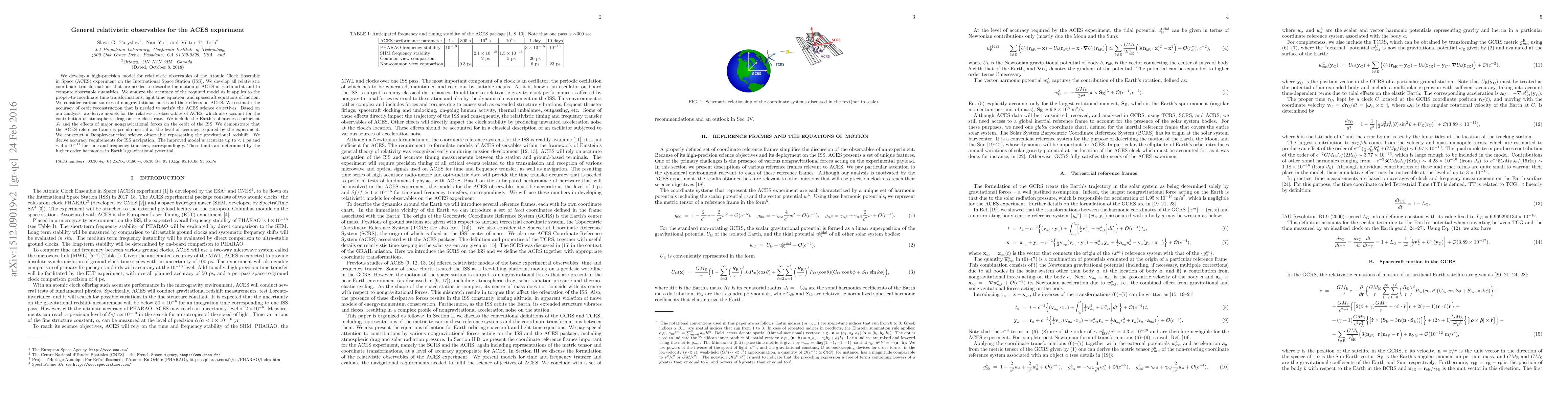 We develop a high-precision model for relativistic observables of the Atomic Clock Ensemble in Space (ACES) experiment on the International Space Station (ISS). We develop all relativistic coordinate transformations that are needed to describe the motion of ACES in Earth orbit and to compute observable quantities. We analyze the accuracy of the required model as it applies to the proper-to-coordinate time transformations, light time equation, and spacecraft equations of motion. We consider various sources of nongravitational noise and their effects on ACES. We estimate the accuracy of orbit reconstruction that is needed to satisfy the ACES science objectives. Based on our analysis, we derive models for the relativistic observables of ACES, which also account for the contribution of atmospheric drag on the clock rate. We include the Earth's oblateness coefficient $J_2$ and the effects of major nongravitational forces on the orbit of the ISS. We demonstrate that the ACES reference frame is pseudo-inertial at the level of accuracy required by the experiment. We construct a Doppler-canceled science observable representing the gravitational redshift. We derive accuracy requirements for ISS navigation. The improved model is accurate up to $<1$ ps and $\sim 4\times 10^{-17}$ for time and frequency transfers, correspondingly. These limits are determined by the higher order harmonics in Earth's gravitational potential.