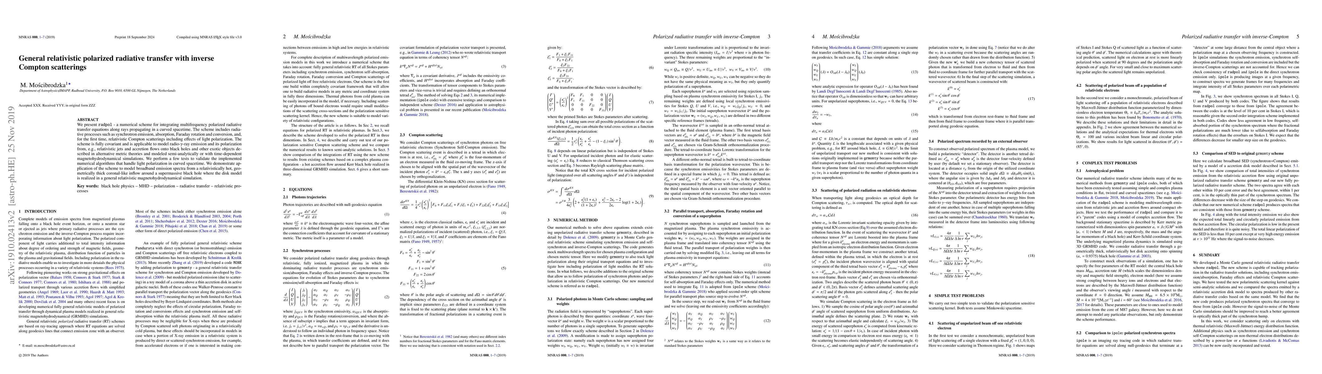 We present {\tt radpol} - a numerical scheme for integrating multifrequency polarized radiative transfer equations along rays propagating in a curved spacetime. The scheme includes radiative processes such as synchrotron emission, absorption, Faraday rotation and conversion, and, for the first time, relativistic Compton scatterings including effects of light polarization. The scheme is fully covariant and is applicable to model radio-$\gamma$-ray emission and its polarization from, e.g., relativistic jets and accretion flows onto black holes and other exotic objects described in alternative metric theories and modeled semi-analytically or with time-dependent magnetohydrodynamical simulations. We perform a few tests to validate the implemented numerical algorithms that handle light polarization in curved spacetime. We demonstrate application of the scheme to model broadband emission spectra from a relativistically hot, geometrically thick coronal-like inflow around a supermassive black hole where the disk model is realized in a general relativistic magnetohydrodynamical simulation.