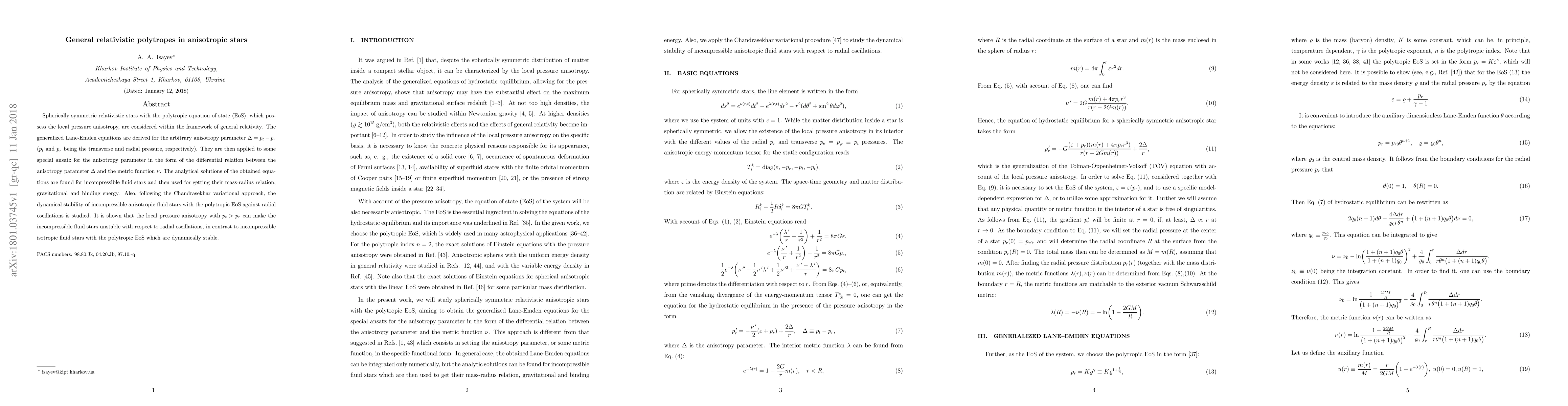 Spherically symmetric relativistic stars with the polytropic equation of state (EoS), which possess the local pressure anisotropy, are considered within the framework of general relativity. The generalized Lane-Emden equations are derived for the arbitrary anisotropy parameter $\Delta=p_t-p_r$ ($p_t$ and $p_r$ being the transverse and radial pressure, respectively). They are then applied to some special ansatz for the anisotropy parameter in the form of the differential relation between the anisotropy parameter $\Delta$ and the metric function $\nu$. The analytical solutions of the obtained equations are found for incompressible fluid stars and then used for getting their mass-radius relation, gravitational and binding energy. Also, following the Chandrasekhar variational approach, the dynamical stability of incompressible anisotropic fluid stars with the polytropic EoS against radial oscillations is studied. It is shown that the local pressure anisotropy with $p_t>p_r$ can make the incompressible fluid stars unstable with respect to radial oscillations, in contrast to incompressible isotropic fluid stars with the polytropic EoS which are dynamically stable.