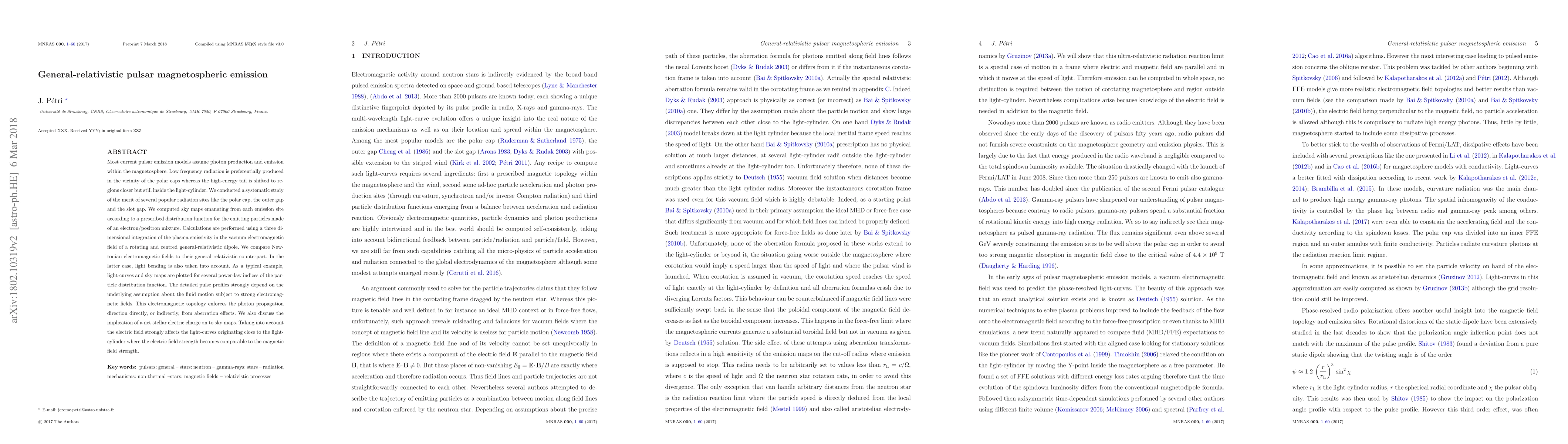 Most current pulsar emission models assume photon production and emission within the magnetosphere. Low frequency radiation is preferentially produced in the vicinity of the polar caps whereas the high-energy tail is shifted to regions closer but still inside the light-cylinder. We conducted a systematic study of the merit of several popular radiation sites like the polar cap, the outer gap and the slot gap. We computed sky maps emanating from each emission site according to a prescribed distribution function for the emitting particles made of an electron/positron mixture. Calculations are performed using a three dimensional integration of the plasma emissivity in the vacuum electromagnetic field of a rotating centred general-relativistic dipole. We compare Newtonian electromagnetic fields to their general-relativistic counterpart. In the latter case, light bending is also taken into account. As a typical example, light-curves and sky maps are plotted for several power-law indices of the particle distribution function. The detailed pulse profiles strongly depend on the underlying assumption about the fluid motion subject to strong electromagnetic fields. This electromagnetic topology enforces the photon propagation direction directly, or indirectly, from aberration effects. We also discuss the implication of a net stellar electric charge on to the sky maps. Taking into account the electric field strongly affects the light-curves originating close to the light-cylinder where the electric field strength becomes comparable to the magnetic field strength.
