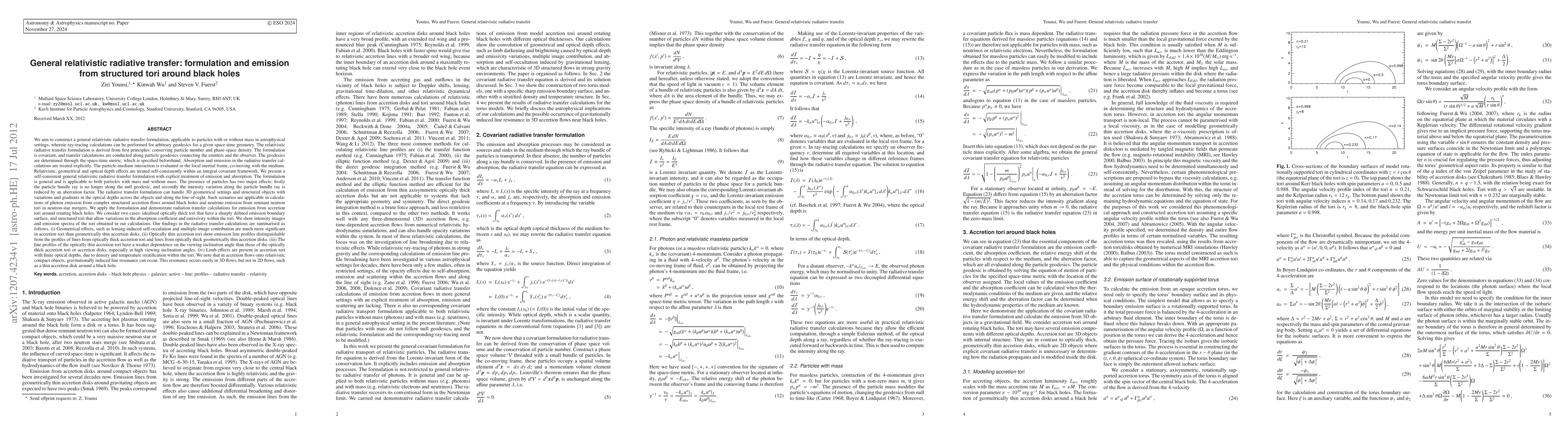 This paper develops a general relativistic radiative transfer formulation applicable to both massive and massless particles in astrophysical contexts. The model accounts for absorption, emission, and relativistic effects in 3D structured objects like accretion tori around black holes, revealing significant geometrical effects such as lensing and multiple-image contributions.