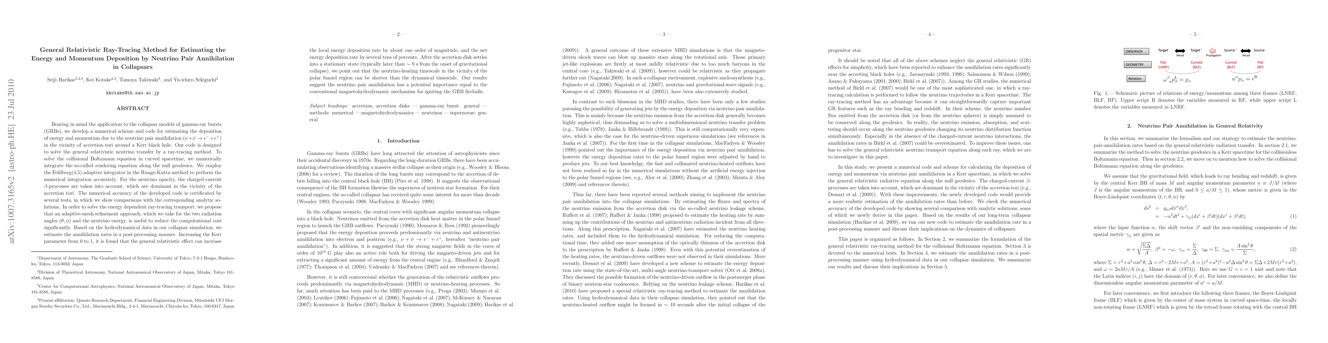 Bearing in mind the application to the collapsar models of gamma-ray bursts (GRBs), we develop a numerical scheme and code for estimating the deposition of energy and momentum due to the neutrino pair annihilation ($\nu + {\bar \nu} \rightarrow e^{-} + e^{+}$) in the vicinity of accretion tori around a Kerr black hole. Our code is designed to solve the general relativistic neutrino transfer by a ray-tracing method. To solve the collisional Boltzmann equation in curved spacetime, we numerically integrate the so-called rendering equation along the null geodesics. For the neutrino opacity, the charged-current $\beta$-processes are taken into account, which are dominant in the vicinity of the accretion tori. The numerical accuracy of the developed code is certificated by several tests, in which we show comparisons with the corresponding analytic solutions. Based on the hydrodynamical data in our collapsar simulation, we estimate the annihilation rates in a post-processing manner. Increasing the Kerr parameter from 0 to 1, it is found that the general relativistic effect can increase the local energy deposition rate by about one order of magnitude, and the net energy deposition rate by several tens of percents. After the accretion disk settles into a stationary state (typically later than $\sim 9$ s from the onset of gravitational collapse), we point out that the neutrino-heating timescale in the vicinity of the polar funnel region can be shorter than the dynamical timescale. Our results suggest the neutrino pair annihilation has a potential importance equal to the conventional magnetohydrodynamic mechanism for igniting the GRB fireballs.