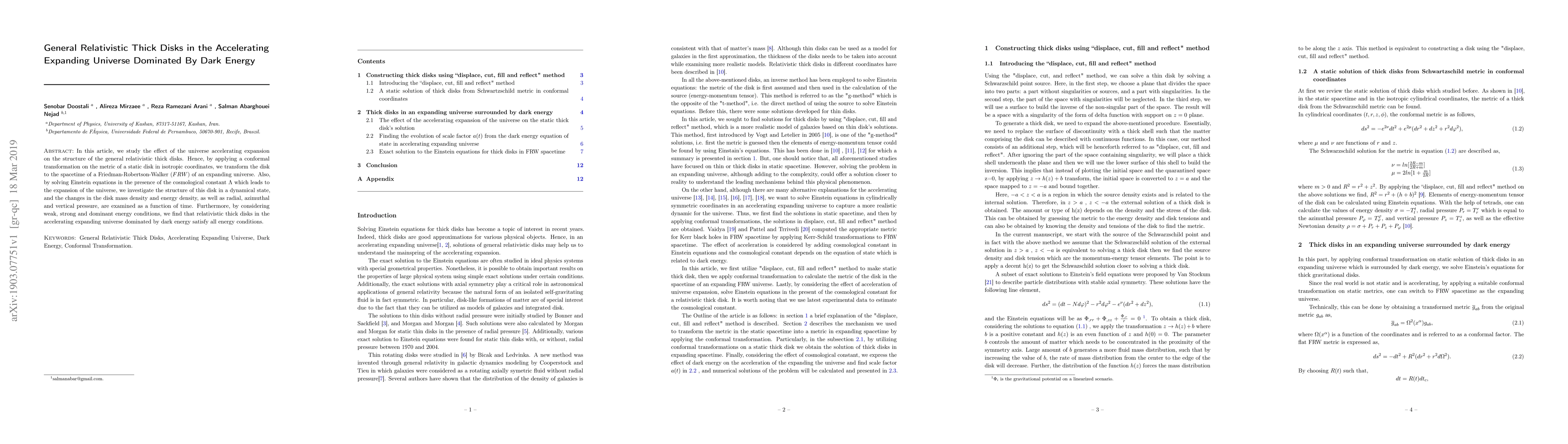 This paper examines the impact of the universe's accelerating expansion on general relativistic thick disks through a conformal transformation of a static disk's metric into a Friedmann-Robertson-Walker (FRW) metric. It investigates changes in disk mass density, energy density, and pressure, confirming that these disks satisfy all energy conditions in a dark energy-dominated universe.