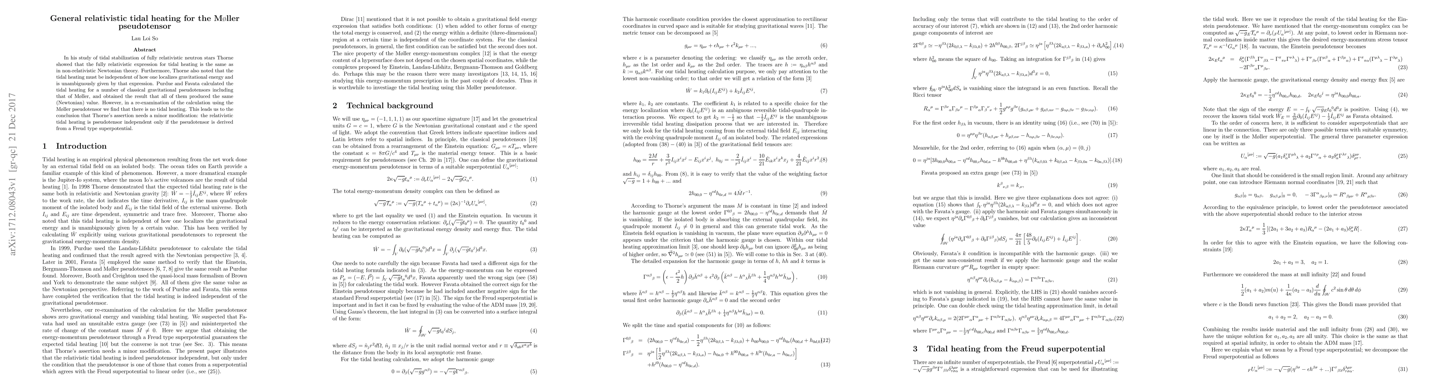 In his study of tidal stabilization of fully relativistic neutron stars Thorne showed that the fully relativistic expression for tidal heating is the same as in non-relativistic Newtonian theory. Furthermore, Thorne also noted that the tidal heating must be independent of how one localizes gravitational energy and is unambiguously given by that expression. Purdue and Favata calculated the tidal heating for a number of classical gravitational pseudotensors including that of Moller, and obtained the result that all of them produced the same (Newtonian) value. However, in a re-examination of the calculation using the Moller pseudotensor we find that there is no tidal heating. This leads us to the conclusion that Thorne's assertion needs a minor modification: the relativistic tidal heating is pseudotensor independent only if the pseudotensor is derived from a Freud type superpotential.