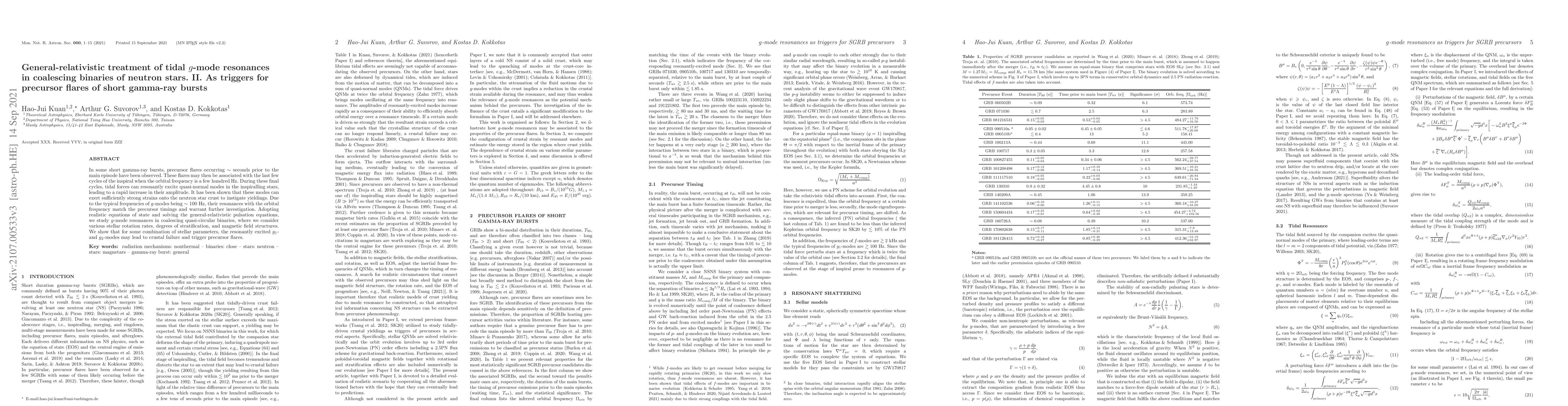 In some short gamma-ray bursts, precursor flares occurring $\sim$ seconds prior to the main episode have been observed. These flares may then be associated with the last few cycles of the inspiral when the orbital frequency is a few hundred Hz. During these final cycles, tidal forces can resonantly excite quasi-normal modes in the inspiralling stars, leading to a rapid increase in their amplitude. It has been shown that these modes can exert sufficiently strong strains onto the neutron star crust to instigate yieldings. Due to the typical frequencies of $g$-modes being $\sim 100\text{ Hz}$, their resonances with the orbital frequency match the precursor timings and warrant further investigation. Adopting realistic equations of state and solving the general-relativistic pulsation equations, we study $g$-mode resonances in coalescing quasi-circular binaries, where we consider various stellar rotation rates, degrees of stratification, and magnetic field structures. We show that for some combination of stellar parameters, the resonantly excited $g_1$- and $g_2$-modes may lead to crustal failure and trigger precursor flares.