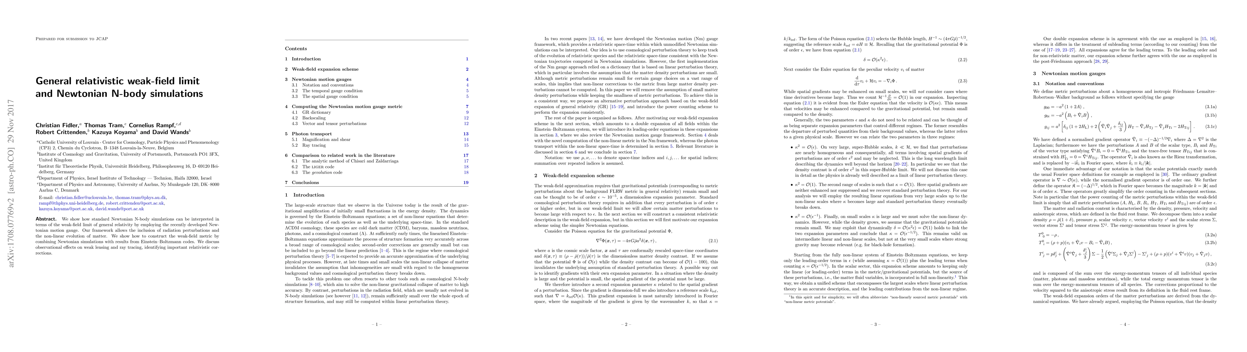 This paper demonstrates how Newtonian N-body simulations can be reinterpreted within the weak-field limit of general relativity using the Newtonian motion gauge, enabling the inclusion of radiation perturbations and non-linear matter evolution. It constructs a weak-field metric by integrating Newtonian simulations with Einstein-Boltzmann codes and discusses relativistic corrections for observational effects like weak lensing and ray tracing.