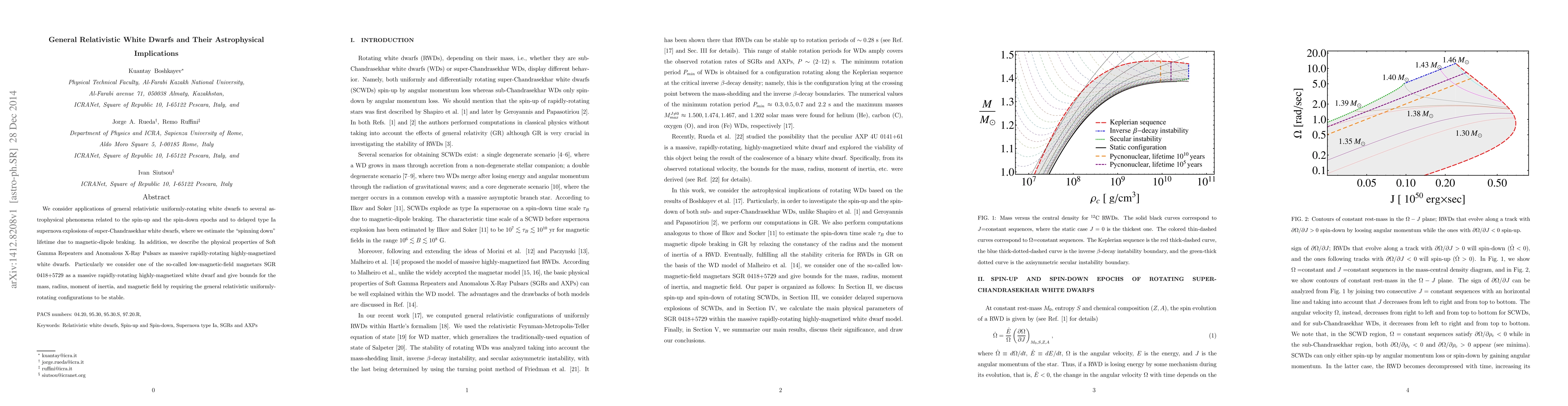 This paper explores the astrophysical implications of general relativistic uniformly-rotating white dwarfs, focusing on their spin-up and spin-down phases and their role in delayed type Ia supernova explosions. It also investigates the physical properties of Soft Gamma Repeaters and Anomalous X-Ray Pulsars, providing stability bounds for a specific low-magnetic-field magnetar.