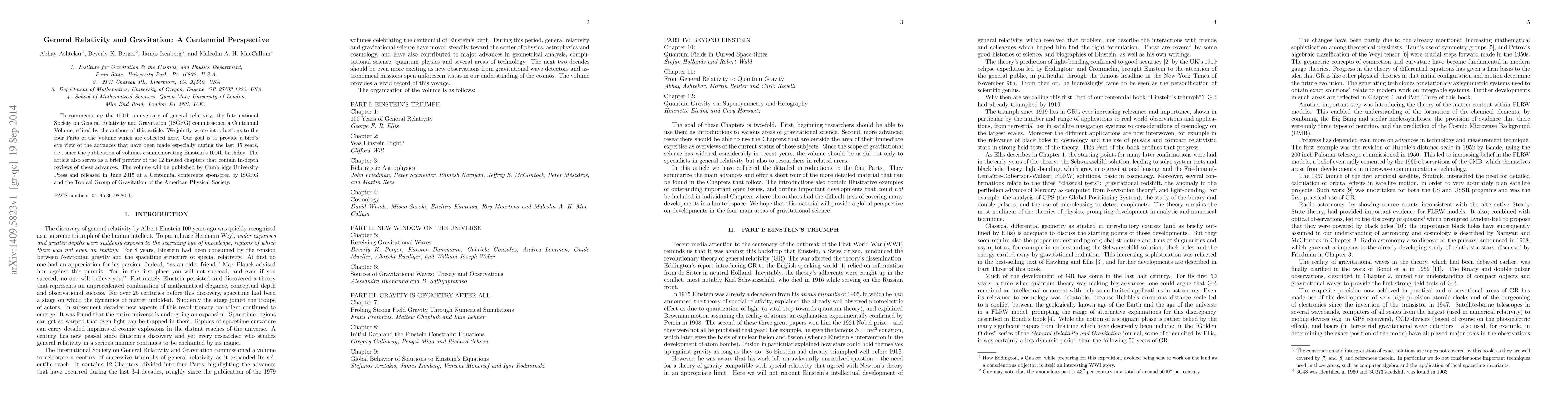 This paper provides an overview of the significant advancements in general relativity and gravitation research over the past 35 years, marking the 100th anniversary of Einstein's theory. The authors introduce the four parts of a comprehensive Centennial Volume, previewing the detailed reviews in the 12 invited chapters.