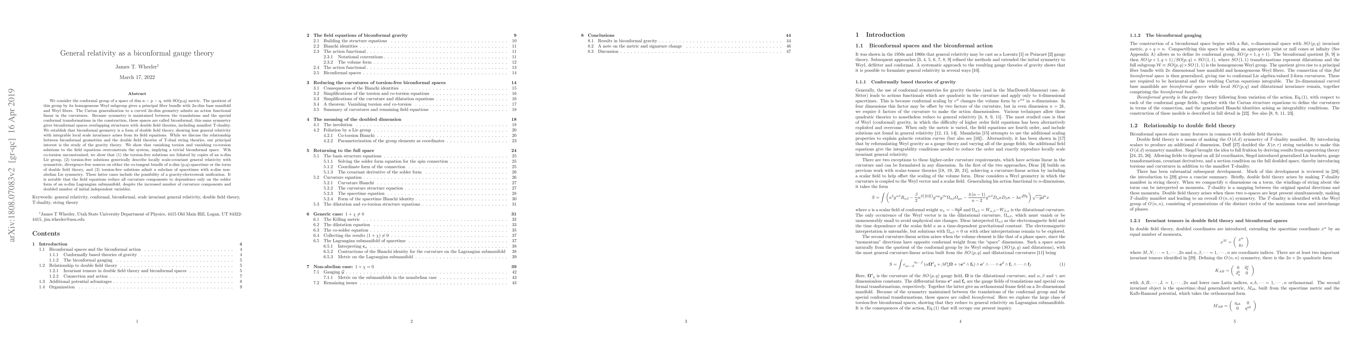This paper explores general relativity as a biconformal gauge theory, demonstrating that biconformal geometry is a form of double field theory. It shows that torsion-free solutions to the field equations describe locally scale-invariant general relativity, potentially leading to a unification of gravity and electroweak forces.