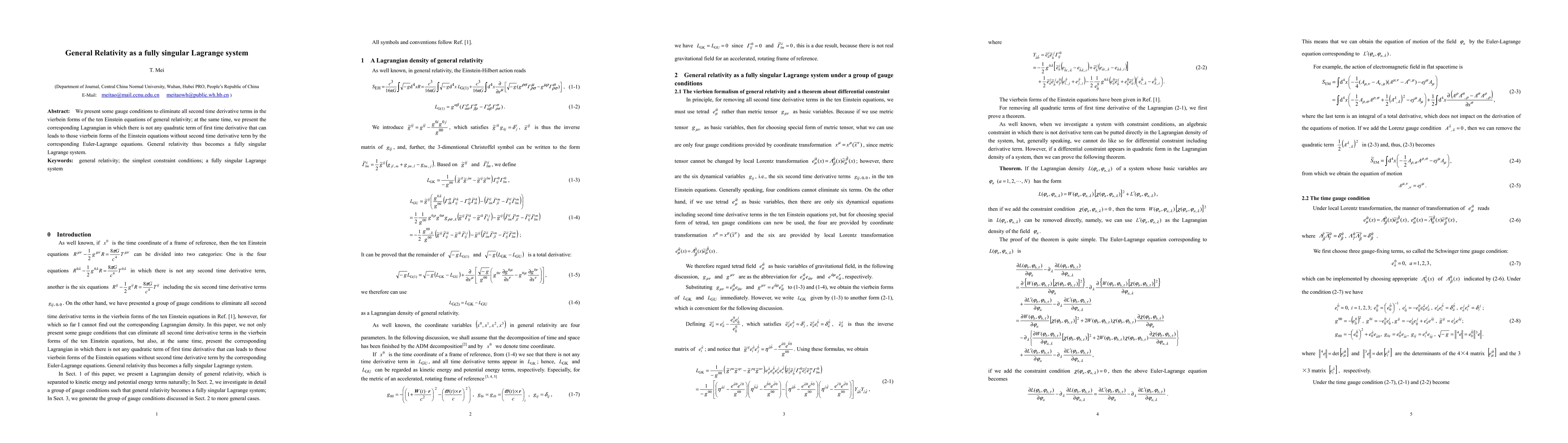 This paper reformulates general relativity by eliminating second-time derivative terms in the Einstein equations using gauge conditions, presenting a Lagrangian without quadratic first-time derivative terms, thus characterizing general relativity as a fully singular Lagrange system.