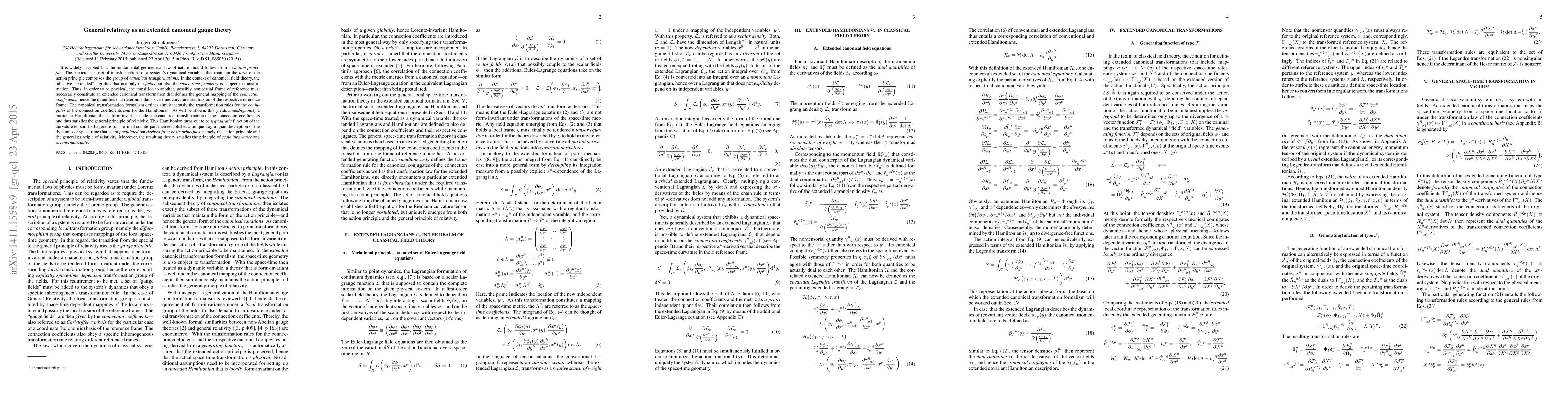 This paper proposes that general relativity can be reformulated as an extended canonical gauge theory, where both fields and space-time geometry undergo transformations. The derived Hamiltonian, invariant under these transformations, leads to a Lagrangian description of space-time dynamics that is derived from fundamental principles rather than postulated.