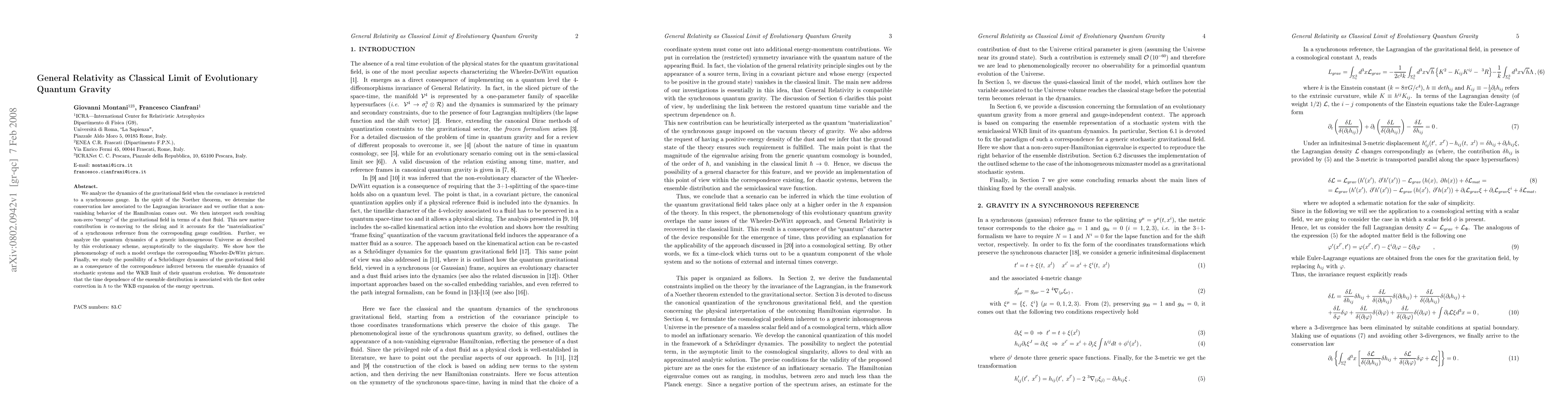 We analyze the dynamics of the gravitational field when the covariance is restricted to a synchronous gauge. In the spirit of the Noether theorem, we determine the conservation law associated to the Lagrangian invariance and we outline that a non-vanishing behavior of the Hamiltonian comes out. We then interpret such resulting non-zero ``energy'' of the gravitational field in terms of a dust fluid. This new matter contribution is co-moving to the slicing and it accounts for the ``materialization'' of a synchronous reference from the corresponding gauge condition. Further, we analyze the quantum dynamics of a generic inhomogeneous Universe as described by this evolutionary scheme, asymptotically to the singularity. We show how the phenomenology of such a model overlaps the corresponding Wheeler-DeWitt picture. Finally, we study the possibility of a Schr\"odinger dynamics of the gravitational field as a consequence of the correspondence inferred between the ensemble dynamics of stochastic systems and the WKB limit of their quantum evolution. We demonstrate that the time dependence of the ensemble distribution is associated with the first order correction in $\hbar$ to the WKB expansion of the energy spectrum.