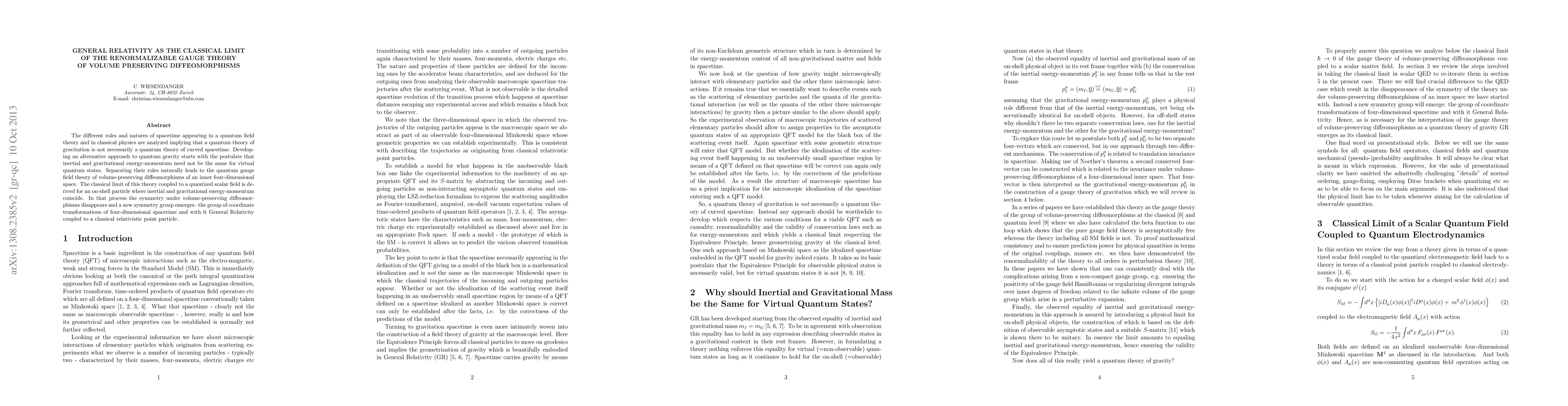 The different roles and natures of spacetime appearing in a quantum field theory and in classical physics are analyzed implying that a quantum theory of gravitation is not necessarily a quantum theory of curved spacetime. Developing an alternative approach to quantum gravity starts with the postulate that inertial and gravitational energy-momentum need not be the same for virtual quantum states. Separating their roles naturally leads to the quantum gauge field theory of volume-preserving diffeomorphisms of an inner four-dimensional space. The classical limit of this theory coupled to a quantized scalar field is derived for an on-shell particle where inertial and gravitational energy-momentum coincide. In that process the symmetry under volume-preserving diffeomorphisms disappears and a new symmetry group emerges: the group of coordinate transformations of four-dimensional spacetime and with it General Relativity coupled to a classical relativistic point particle.