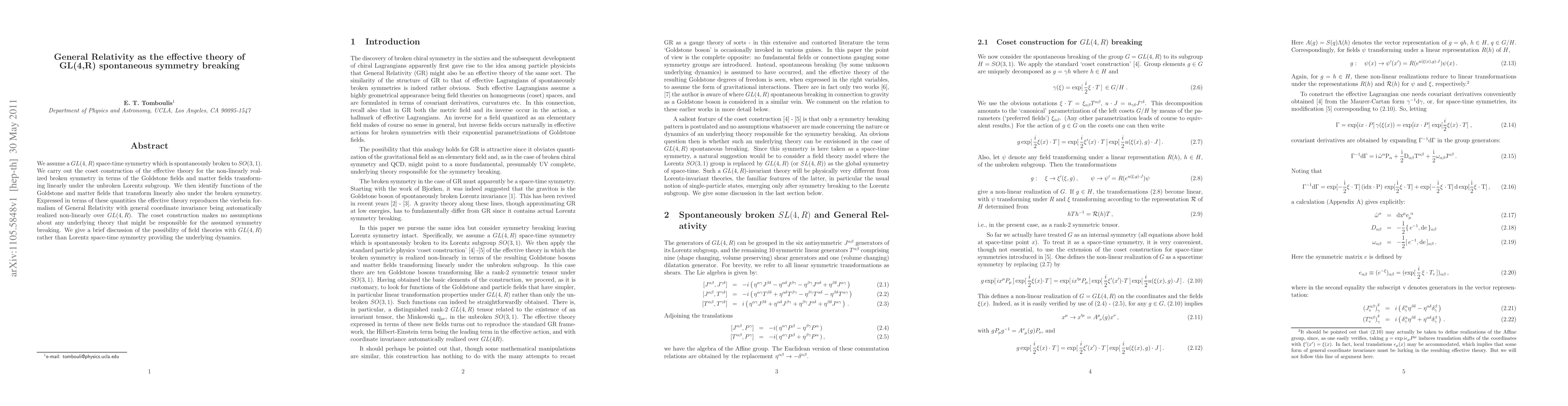 Researchers develop an effective theory that reproduces General Relativity using a coset construction approach, assuming GL(4,R) space-time symmetry is broken to SO(3,1). The theory automatically realizes general coordinate invariance non-linearly over GL(4,R).
