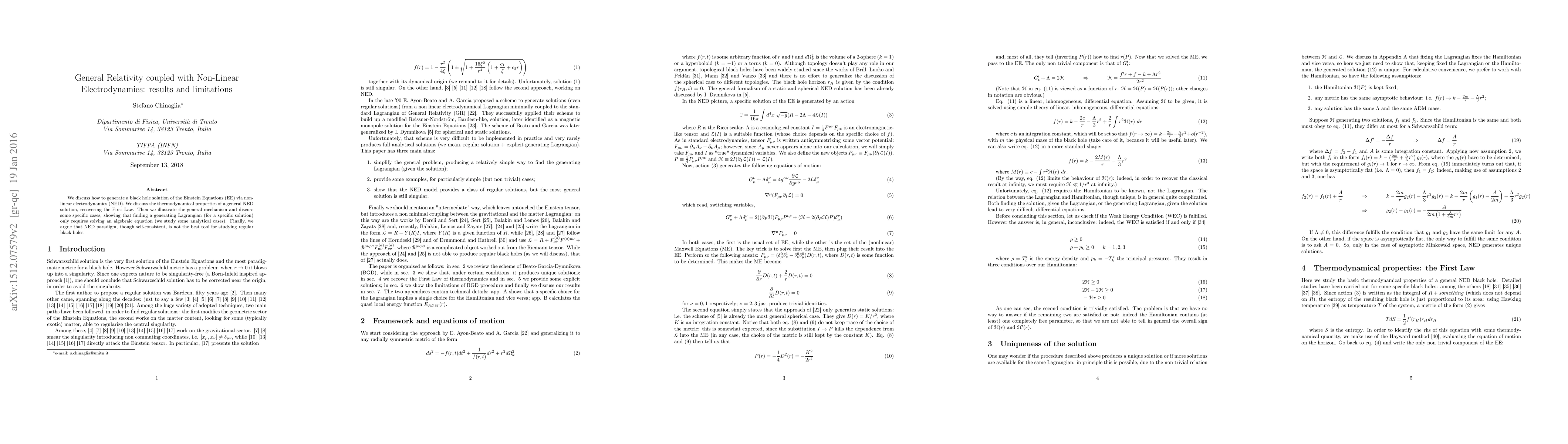 Researchers explored a way to create black holes using non-linear electrodynamics and Einstein Equations, finding that certain solutions can recover the First Law of thermodynamics. However, they argue that this approach is not ideal for studying regular black holes.