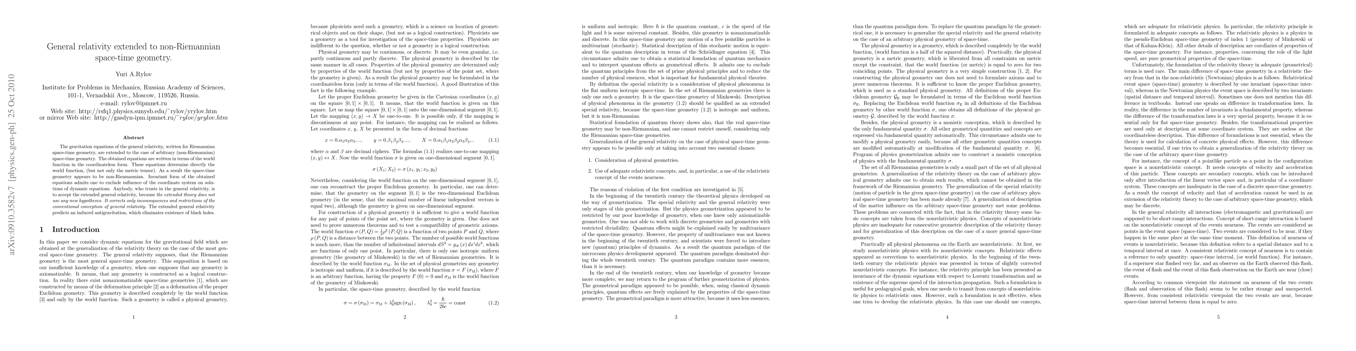 This paper extends the general relativity framework from Riemannian to arbitrary non-Riemannian space-time geometry, proposing equations that determine the world function directly, leading to non-Riemannian geometry and predicting an induced antigravitation that eliminates black holes. The invariant form ensures coordinate-system independence in dynamic solutions.