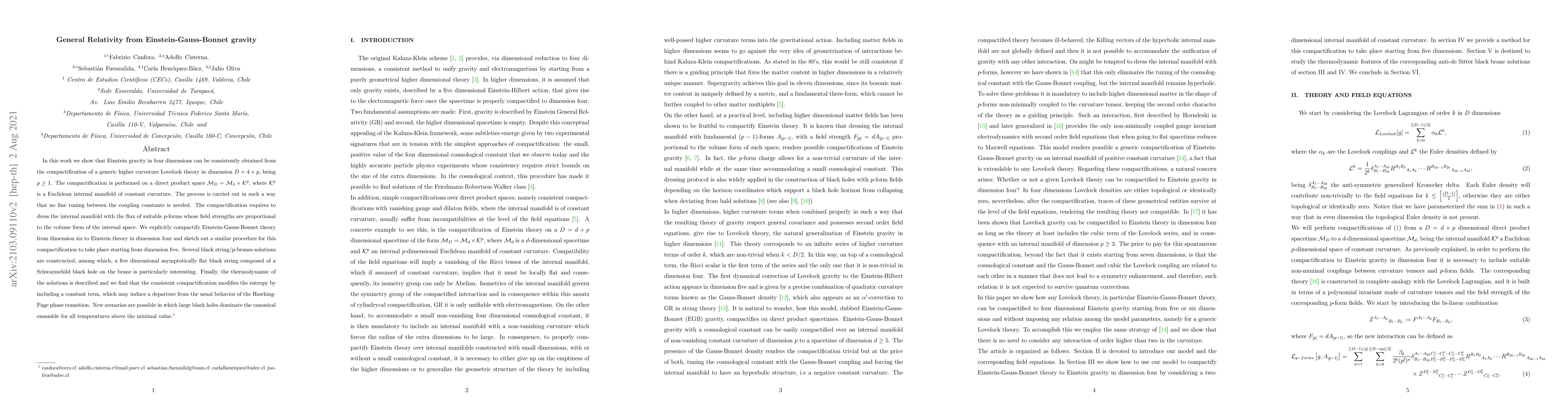 In this work we show that Einstein gravity in four dimensions can be consistently obtained from the compactification of a generic higher curvature Lovelock theory in dimension $D=4+p$, being $p\geq1$. The compactification is performed on a direct product space $\mathcal{M}_D=\mathcal{M}_4\times\mathcal{K}^p$, where $\mathcal{K}^p$ is a Euclidean internal manifold of constant curvature. The process is carried out in such a way that no fine tuning between the coupling constants is needed. The compactification requires to dress the internal manifold with the flux of suitable $p$-forms whose field strengths are proportional to the volume form of the internal space. We explicitly compactify Einstein-Gauss-Bonnet theory from dimension six to Einstein theory in dimension four and sketch out a similar procedure for this compactification to take place starting from dimension five. Several black string/p-branes solutions are constructed, among which, a five dimensional asymptotically flat black string composed of a Schwarzschild black hole on the brane is particularly interesting. Finally, the thermodynamic of the solutions is described and we find that the consistent compactification modifies the entropy by including a constant term, which may induce a departure from the usual behavior of the Hawking-Page phase transition. New scenarios are possible in which large black holes dominate the canonical ensamble for all temperatures above the minimal value.