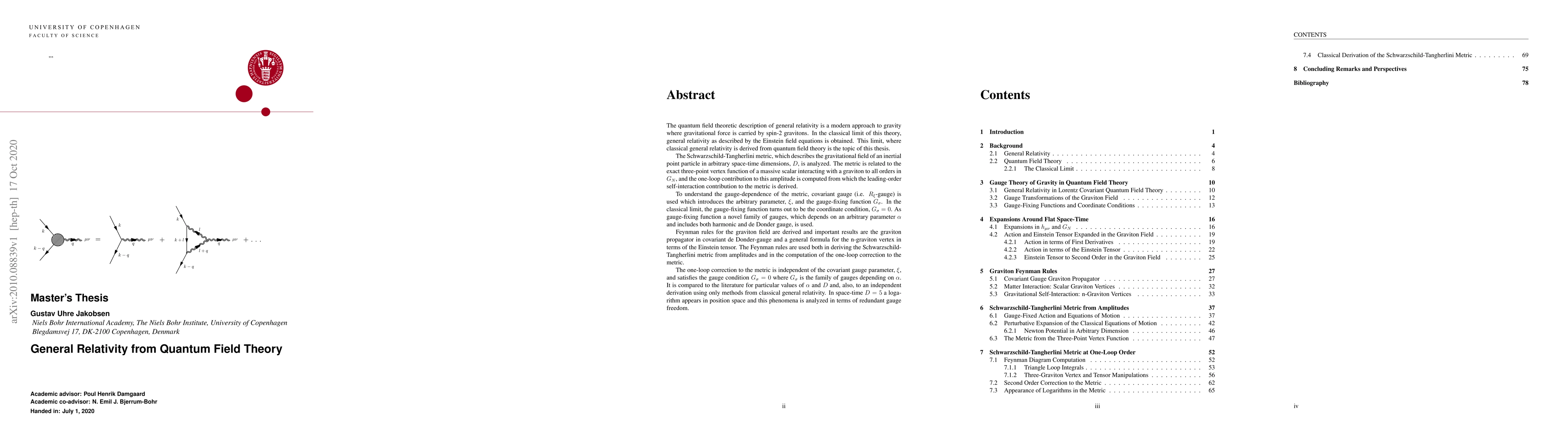 The quantum field theoretic description of general relativity is a modern approach to gravity where gravitational force is carried by spin-2 gravitons. In the classical limit of this theory, general relativity as described by the Einstein field equations is obtained. This limit, where classical general relativity is derived from quantum field theory is the topic of this thesis. The Schwarzschild-Tangherlini metric, which describes the gravitational field of an inertial point particle in arbitrary space-time dimensions, $D$, is analyzed. The metric is related to the three-point vertex function of a massive scalar interacting with a graviton to all orders in $G_N$, and the one-loop contribution to this amplitude is computed from which the $G_N^2$ contribution to the metric is derived. To understand the gauge-dependence of the metric, covariant gauge is used which introduces the parameter, $\xi$, and the gauge-fixing function $G_\sigma$. In the classical limit, the gauge-fixing function turns out to be the coordinate condition, $G_\sigma=0$. As gauge-fixing function a novel family of gauges, which depends on an arbitrary parameter $\alpha$ and includes both harmonic and de Donder gauge, is used. Feynman rules for the graviton field are derived and important results are the graviton propagator in covariant gauge and a general formula for the n-graviton vertex in terms of the Einstein tensor. The Feynman rules are used both in deriving the Schwarzschild-Tangherlini metric from amplitudes and in the computation of the one-loop correction to the metric. The one-loop correction to the metric is independent of the covariant gauge parameter, $\xi$, and satisfies the gauge condition $G_\sigma=0$ where $G_\sigma$ is the family of gauges depending on $\alpha$. In space-time $D=5$ a logarithm appears in position space and this phenomena is analyzed in terms of redundant gauge freedom.