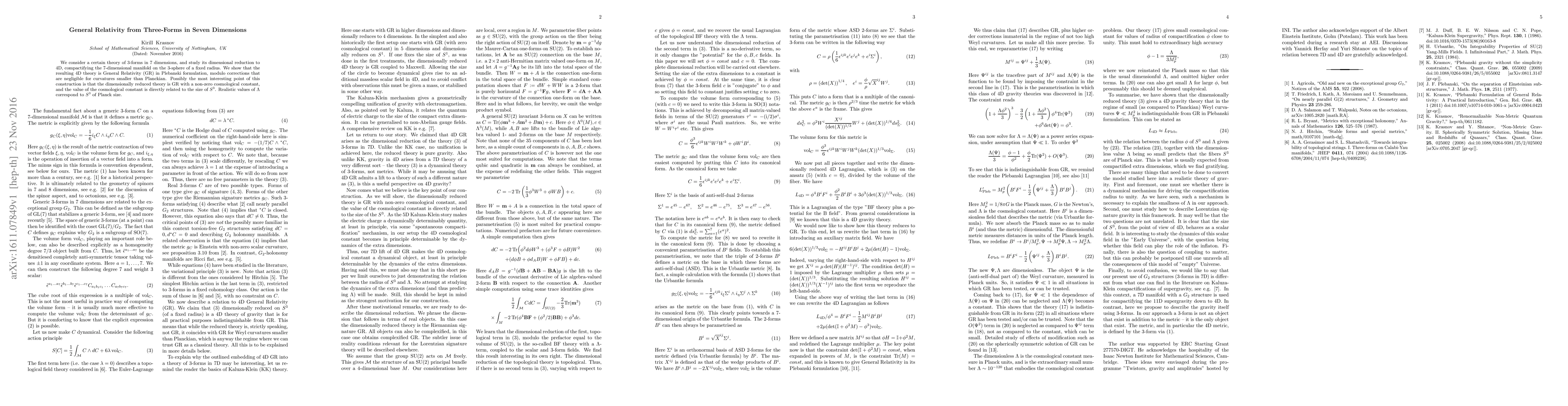 Researchers found that a 7-dimensional theory of 3-forms can be reduced to General Relativity in 4 dimensions, with corrections that disappear for small curvatures, and the cosmological constant is related to the size of the compactified 3-sphere.