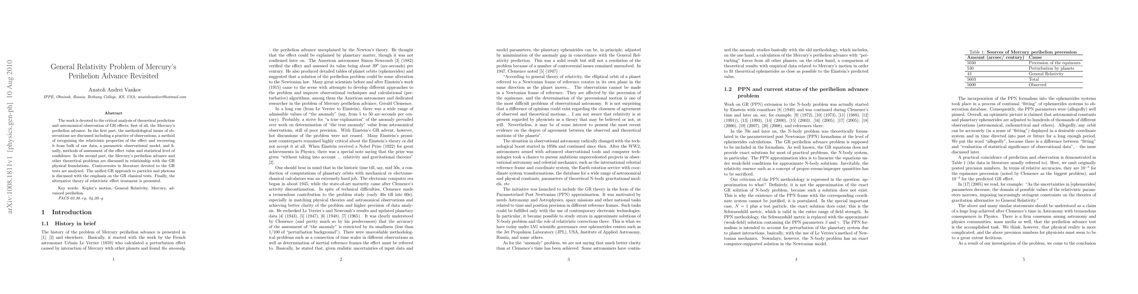 The work is devoted to the critical analysis of theoretical prediction and astronomical observation of GR effects, first of all, the Mercury's perihelion advance. In the first part, the methodological issues of observations are discussed including a practice of observations, a method of recognizing the relativistic properties of the effect and recovering it from bulk of raw data, a parametric observational model, and finally, methods of assessment of the effect value and statistical level of confidence. In the second part, the Mercury's perihelion advance and other theoretical problems are discussed in relationship with the GR physical foundations. Controversies in literature devoted to the GR tests are analyzed. The unified GR approach to particles and photons is discussed with the emphasis on the GR classical tests. Finally, the alternative theory of relativistic effect treatment is presented.