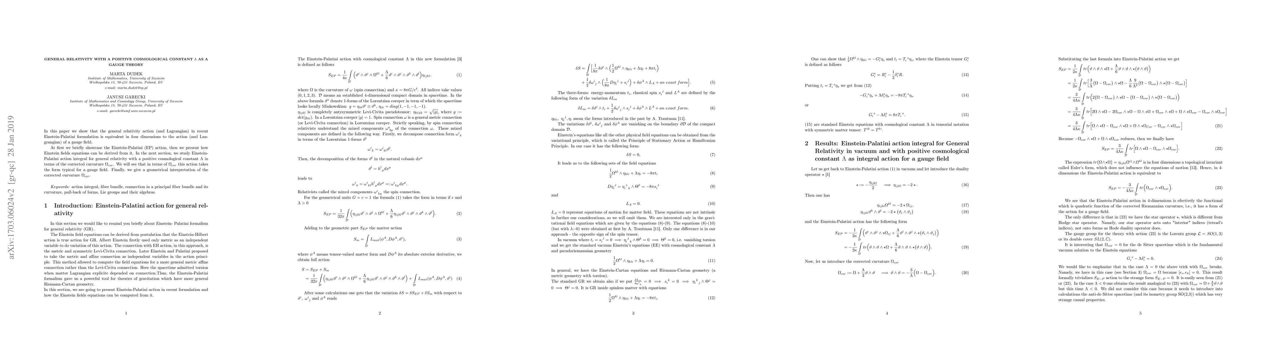 In the paper we show that the general relativity action (and Lagrangian) in recent Einstein-Palatini formulation is equivalent to the action (and Langrangian) of a gauge field. We begin with a bit of information of the Einstein-Palatini (EP) action, then we present how Einstein fields equations can be derived from it. In the next section, we consider Einstein-Palatini action integral for general relativity with a positive cosmological constant $\Lambda $ in terms of $\hat{F}$, the curvature of the affine connection's pulled back from de Sitter bundle to Lorentz bundle. We will see that in terms of $\hat{F}$ this action takes the form typical for a gauge field. Finally, we give a geometrical interpretation of the curvature $\hat{F}$.