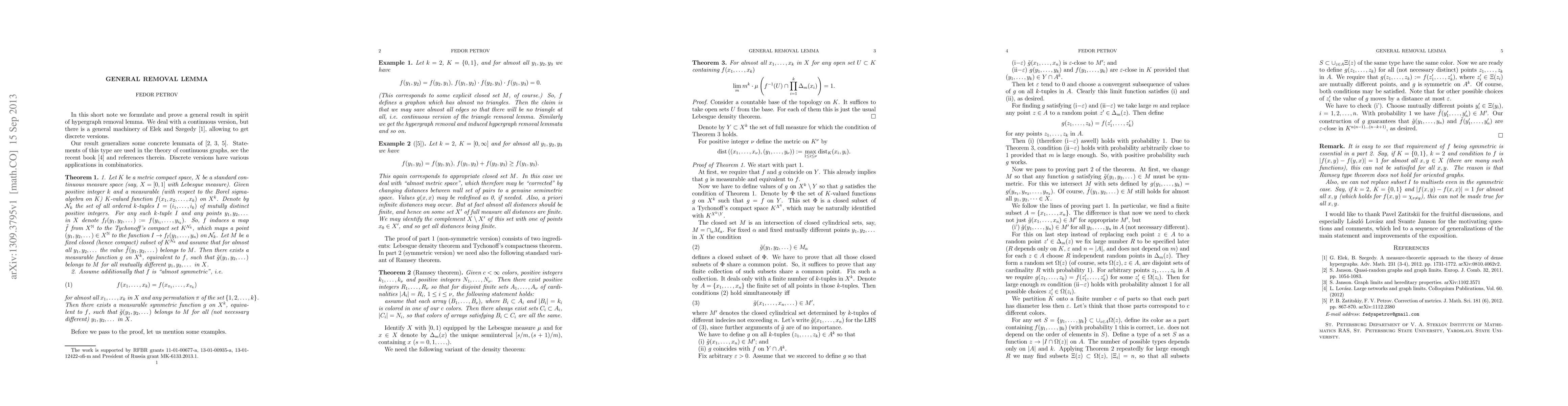 Summary: This paper formulates and proves a general removal lemma for measurable functions of multiple variables, extending the principles of the hypergraph removal lemma to a broader context. The result provides a framework for understanding the structure of such functions.