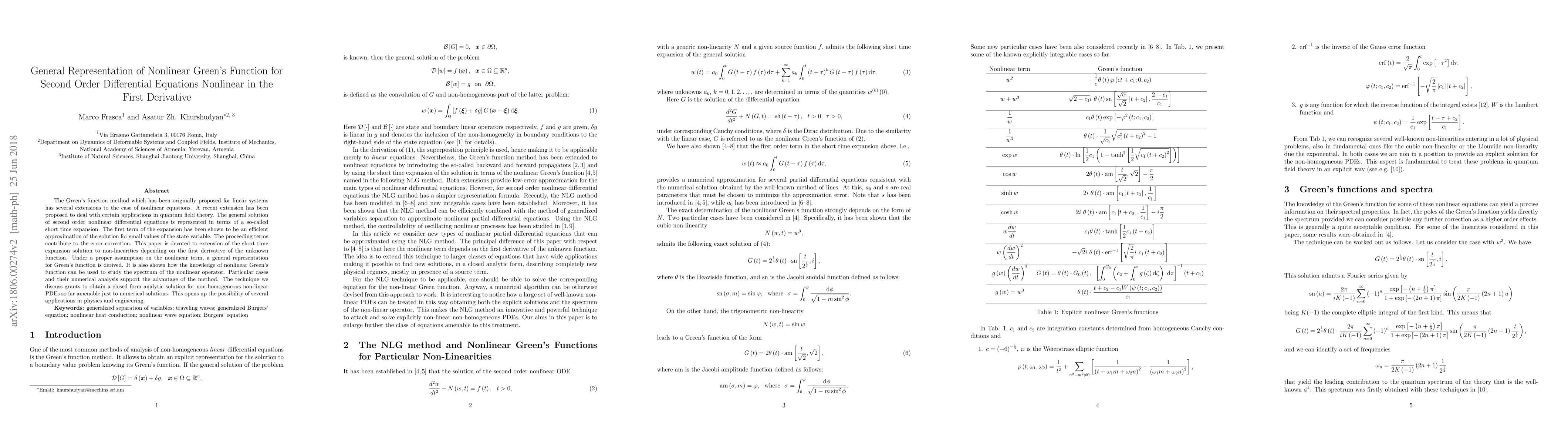The Green's function method which has been originally proposed for linear systems has several extensions to the case of nonlinear equations. A recent extension has been proposed to deal with certain applications in quantum field theory. The general solution of second order nonlinear differential equations is represented in terms of a so-called short time expansion. The first term of the expansion has been shown to be an efficient approximation of the solution for small values of the state variable. The proceeding terms contribute to the error correction. This paper is devoted to extension of the short time expansion solution to non-linearities depending on the first derivative of the unknown function. Under a proper assumption on the nonlinear term, a general representation for Green's function is derived. It is also shown how the knowledge of nonlinear Green's function can be used to study the spectrum of the nonlinear operator. Particular cases and their numerical analysis support the advantage of the method. The technique we discuss grants to obtain a closed form analytic solution for non-homogeneous non-linear PDEs so far amenable just to numerical solutions. This opens up the possibility of several applications in physics and engineering.