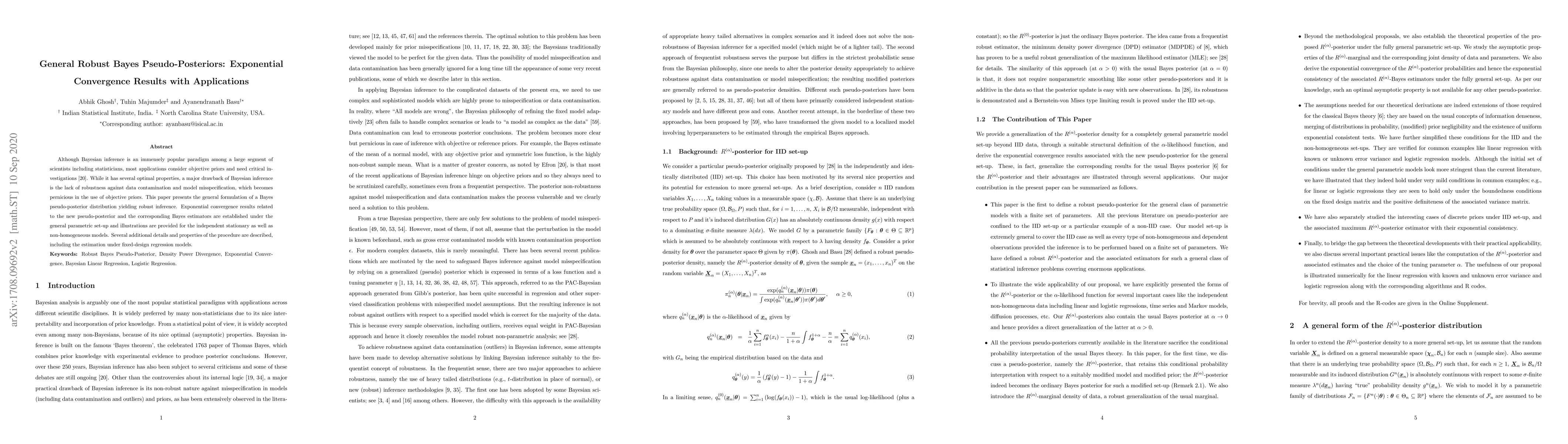 This paper introduces a robust Bayes pseudo-posterior distribution to address the lack of robustness in traditional Bayesian inference against data contamination and model misspecification. It establishes exponential convergence results for the new pseudo-posterior and its estimators, with applications to both stationary and non-homogeneous models.