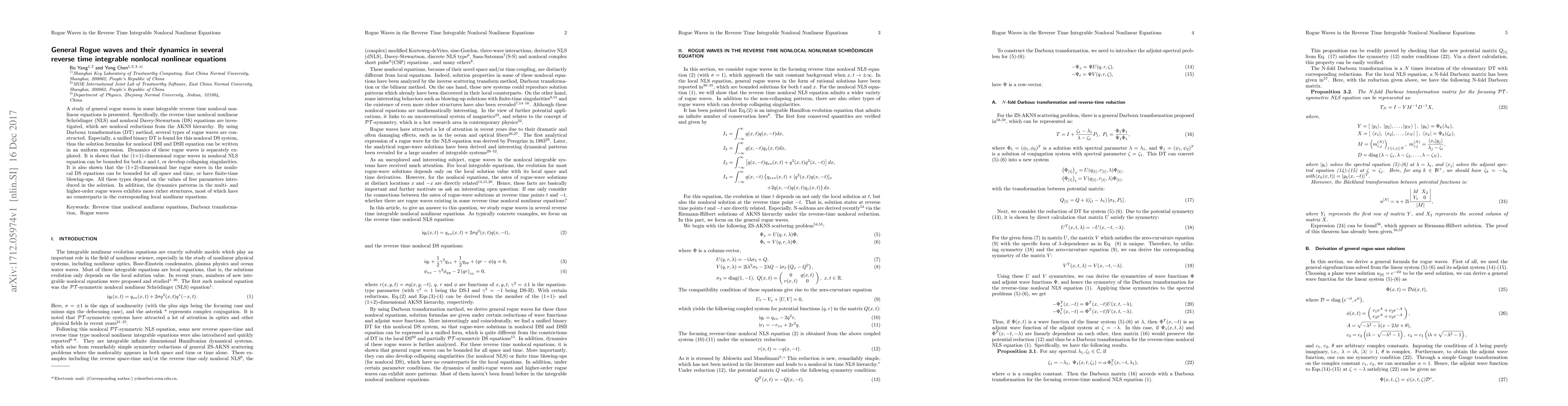 This paper investigates general rogue waves in reverse time integrable nonlocal nonlinear equations, specifically the nonlocal NLS and Davey-Stewartson equations. Using the Darboux transformation method, various rogue wave solutions are constructed, with a focus on the dynamics of these waves, revealing bounded and collapsing behaviors for NLS and finite-time blow-ups for Davey-Stewartson equations.