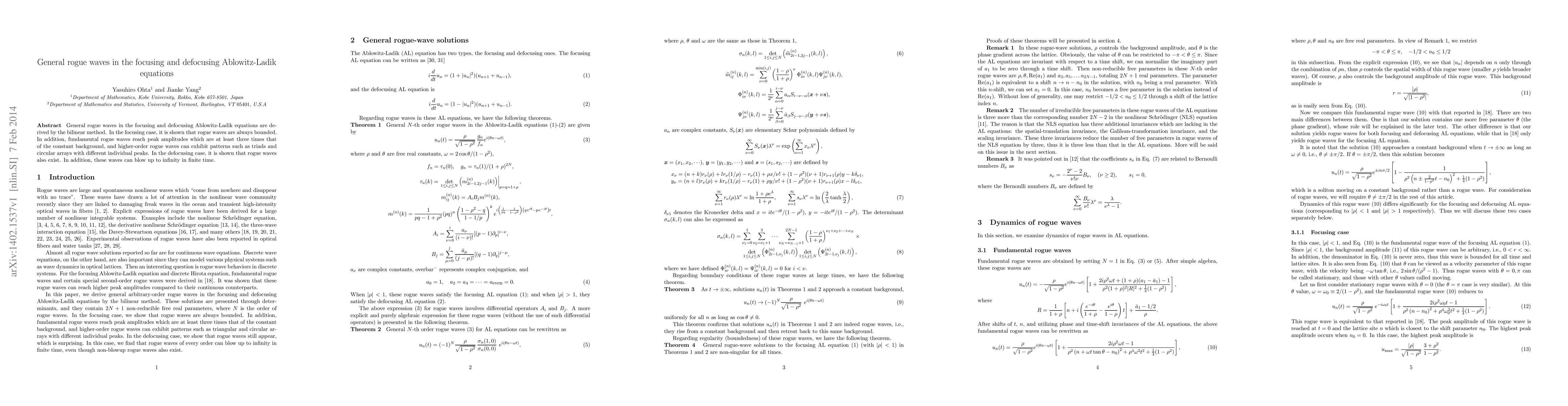 General rogue waves in the focusing and defocusing Ablowitz-Ladik equations are derived by the bilinear method. In the focusing case, it is shown that rogue waves are always bounded. In addition, fundamental rogue waves reach peak amplitudes which are at least three times that of the constant background, and higher-order rogue waves can exhibit patterns such as triads and circular arrays with different individual peaks. In the defocusing case, it is shown that rogue waves also exist. In addition, these waves can blow up to infinity in finite time.