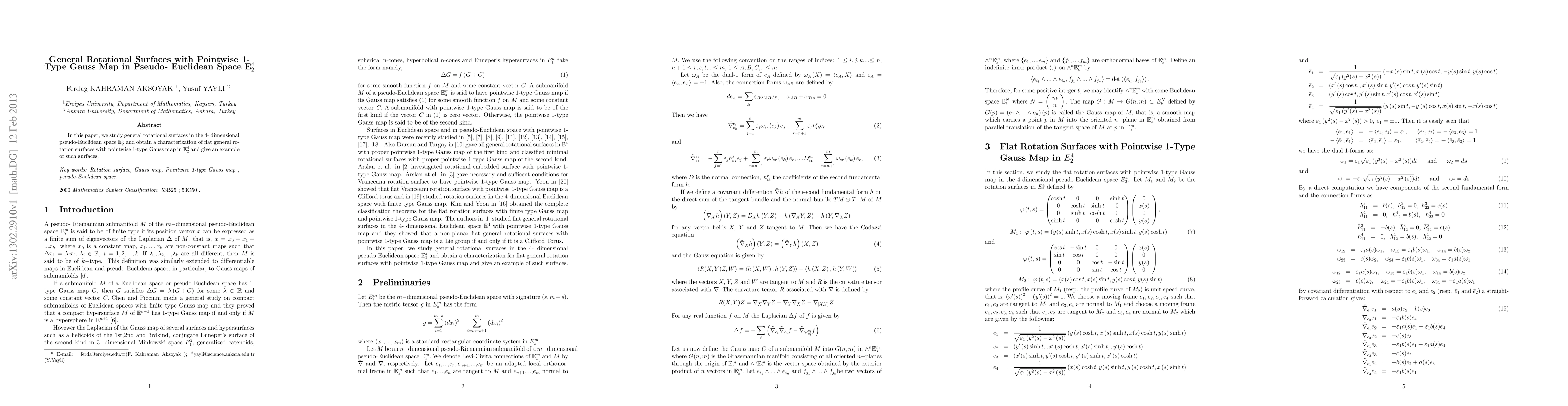 This paper characterizes flat rotational surfaces in 4-dimensional pseudo-Euclidean space E4-2 with a pointwise 1-type Gauss map, providing a detailed example of such surfaces.