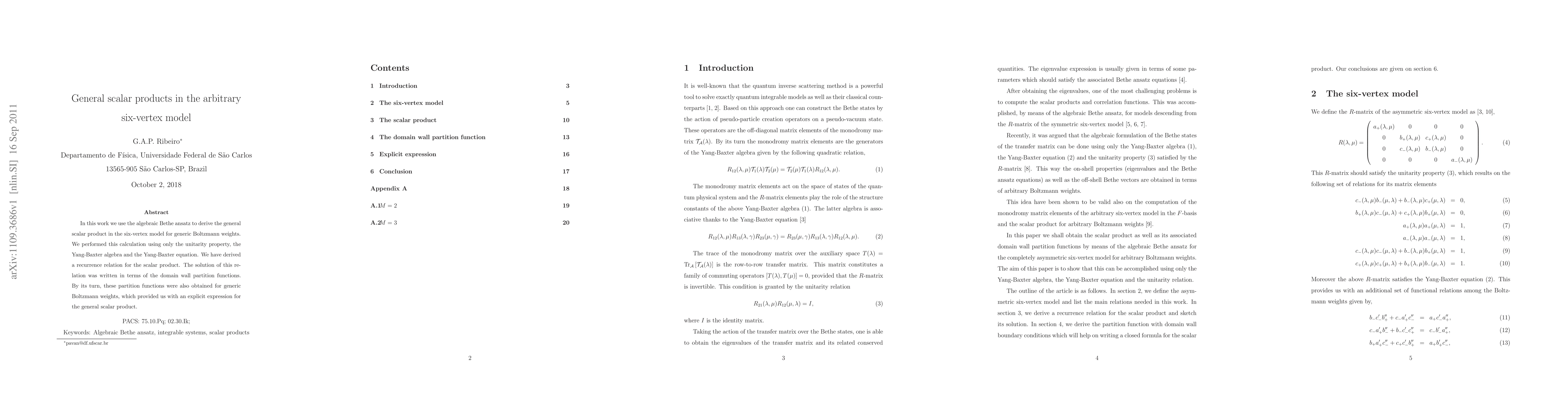 Researchers used algebraic Bethe ansatz to derive a general formula for scalar products in the six-vertex model with generic Boltzmann weights, leading to an explicit expression for the scalar product.