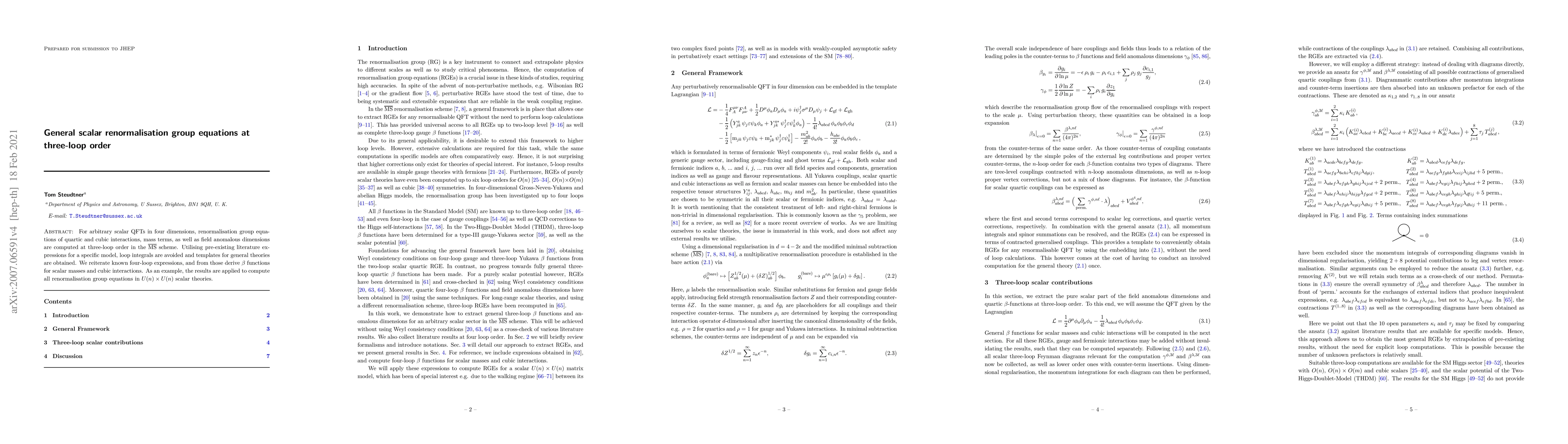 This paper computes three-loop renormalisation group equations for quartic and cubic interactions, mass terms, and field anomalous dimensions in arbitrary four-dimensional scalar quantum field theories using the $\overline{\text{MS}}$ scheme. It avoids loop integrals by leveraging pre-existing model expressions and derives $\beta$ functions for scalar masses and cubic interactions.