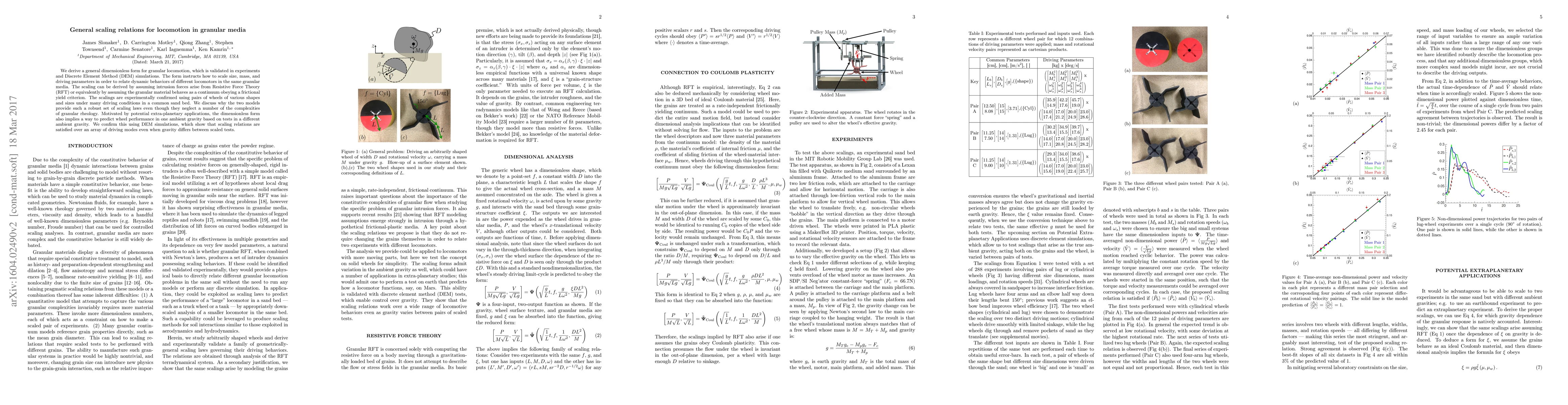 This paper derives a general dimensionless scaling relation for granular locomotion, validated through experiments and simulations, to predict the dynamic behavior of different locomotors in granular media. The derived scaling laws, applicable across varying gravity conditions, are confirmed using various wheel shapes and sizes in sand, demonstrating robust predictive power despite simplifying assumptions.