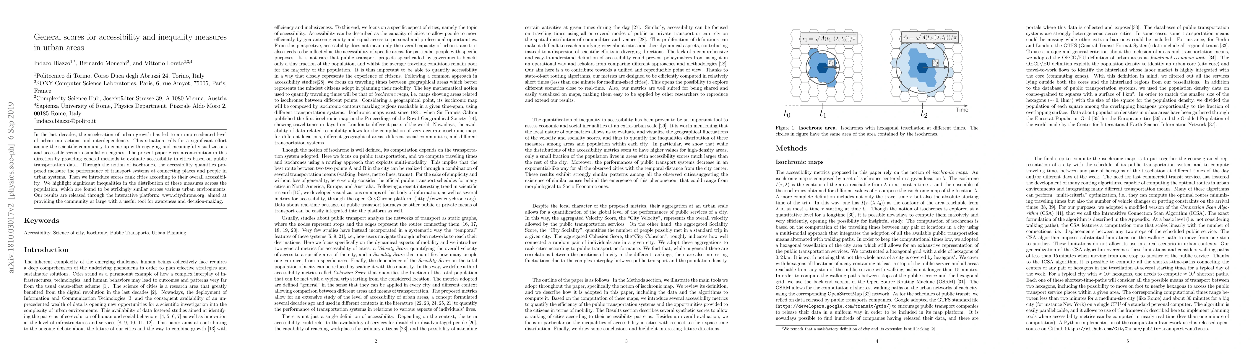 This paper develops methods to assess urban accessibility using public transportation data and isochrones, ranking cities based on their transport system performance. It also reveals significant inequalities in accessibility across populations, offering an interactive platform for public use at www.citychrone.org.