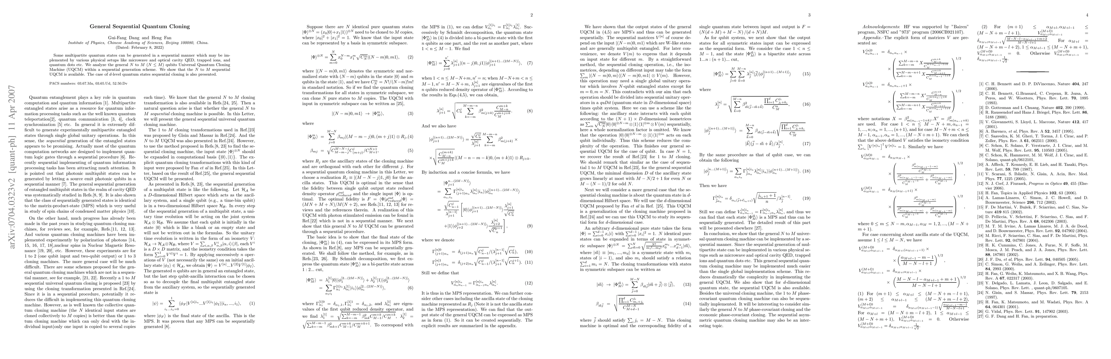 The paper analyzes the general N to M qubits Universal Quantum Cloning Machine (UQCM) within a sequential generation scheme, extending the analysis to d-level quantum states.