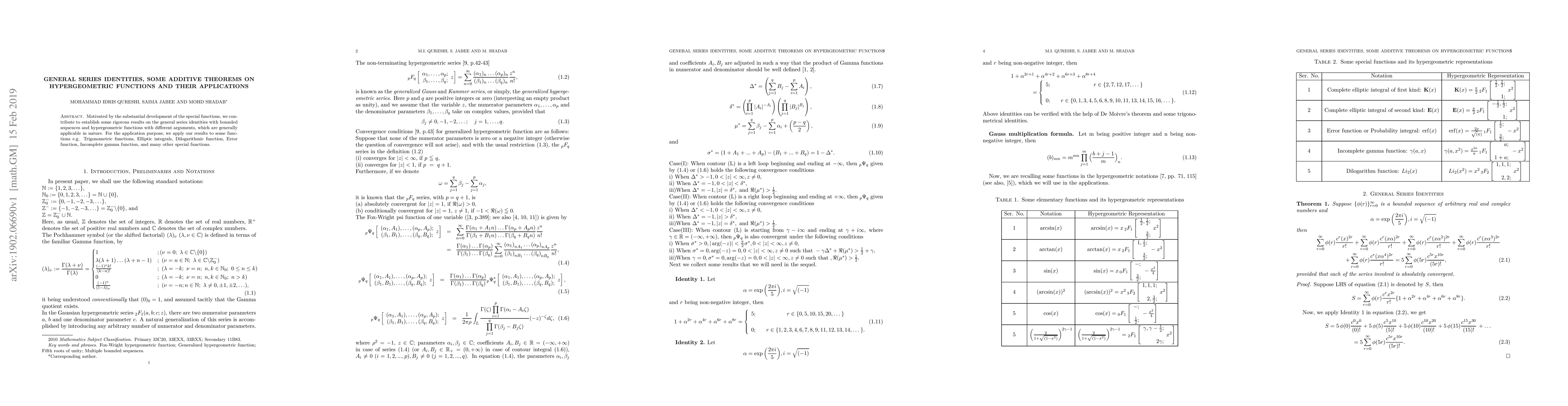 Motivated by the substantial development of the special functions, we contribute to establish some rigorous results on the general series identities with bounded sequences and hypergeometric functions with different arguments, which are generally applicable in nature. For the application purpose, we apply our results to some functions e.g. Trigonometric functions, Elliptic integrals, Dilogarithmic function, Error function, Incomplete gamma function, and many other special functions.