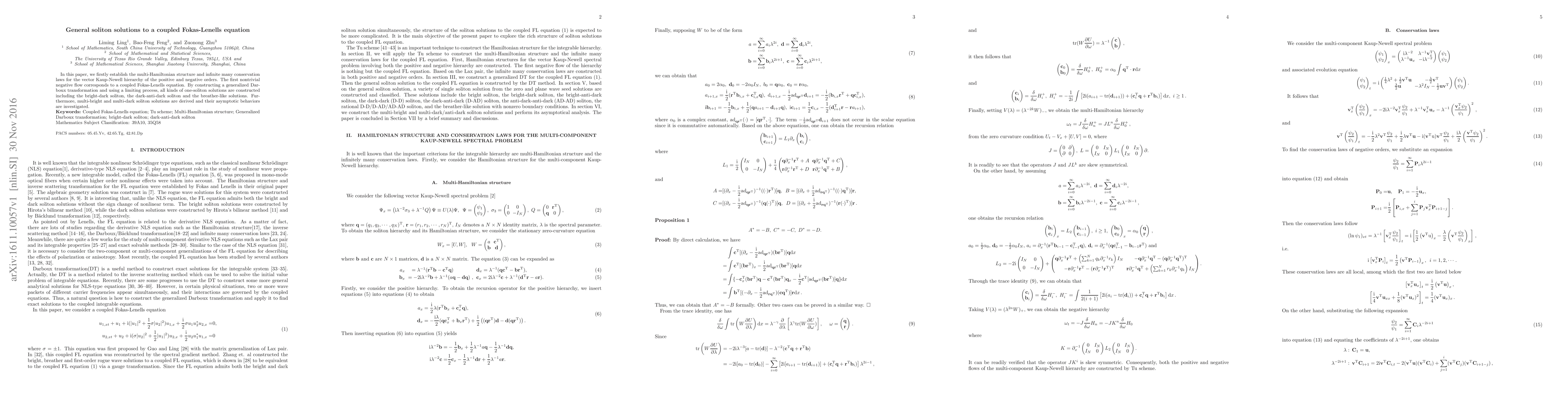 This paper establishes the multi-Hamiltonian structure and infinite conservation laws for the vector Kaup-Newell hierarchy, deriving one-soliton solutions for a coupled Fokas-Lenells equation via a generalized Darboux transformation, including bright-dark, dark-anti-dark solitons, and breather-like solutions, alongside multi-bright and multi-dark soliton solutions with analyzed asymptotic behaviors.