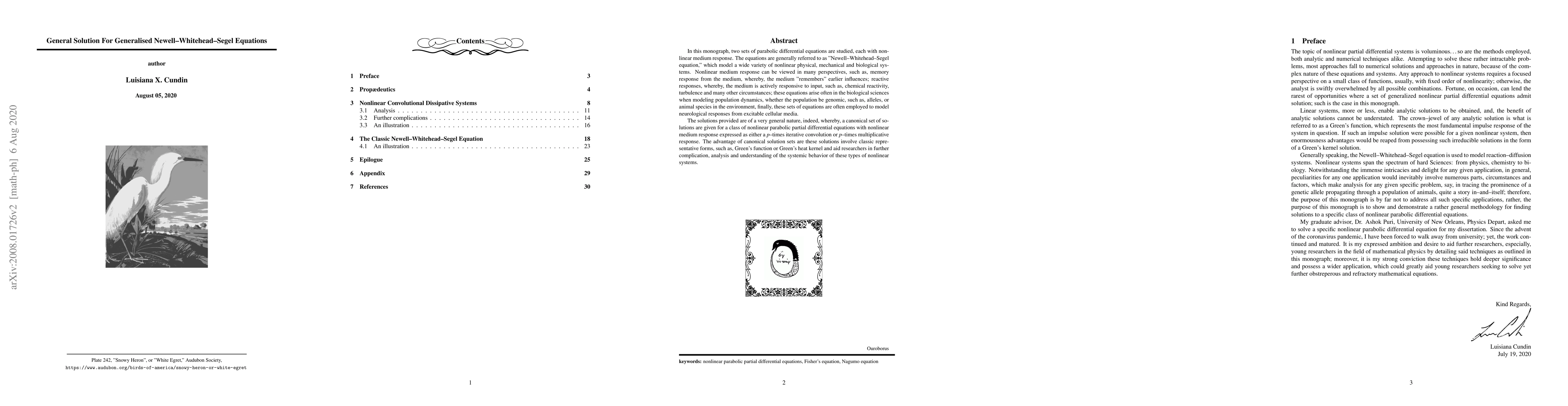In this monograph, two sets of parabolic differential equations are studied, each with nonlinear medium response. The equations are generally referred to as "Newell-Whitehead-Segel equation," which model a wide variety of nonlinear physical, mechanical and biological systems. Nonlinear medium response can be viewed in many perspectives, such as, memory response from the medium, whereby, the medium "remembers" earlier influences; reactive responses, whereby, the medium is actively responsive to input, such as, chemical reactivity, turbulence and many other circumstances; these equations arise often in the biological sciences when modeling population dynamics, whether the population be genomic, such as, alleles, or animal species in the environment; finally, these sets of equations are often employed to model neurological responses from excitable cellular media. The solutions provided are of a very general nature, indeed, whereby, a canonical set of solutions are given for a class of nonlinear parabolic partial differential equations with nonlinear medium response expressed as either a p-times iterative convolution or p-times multiplicative response. The advantage of canonical solution sets are these solutions involve classic representative forms, such as, Green's function or Green's heat kernel and aid researchers in further complication, analysis and understanding of the systemic behavior of these types of nonlinear systems.