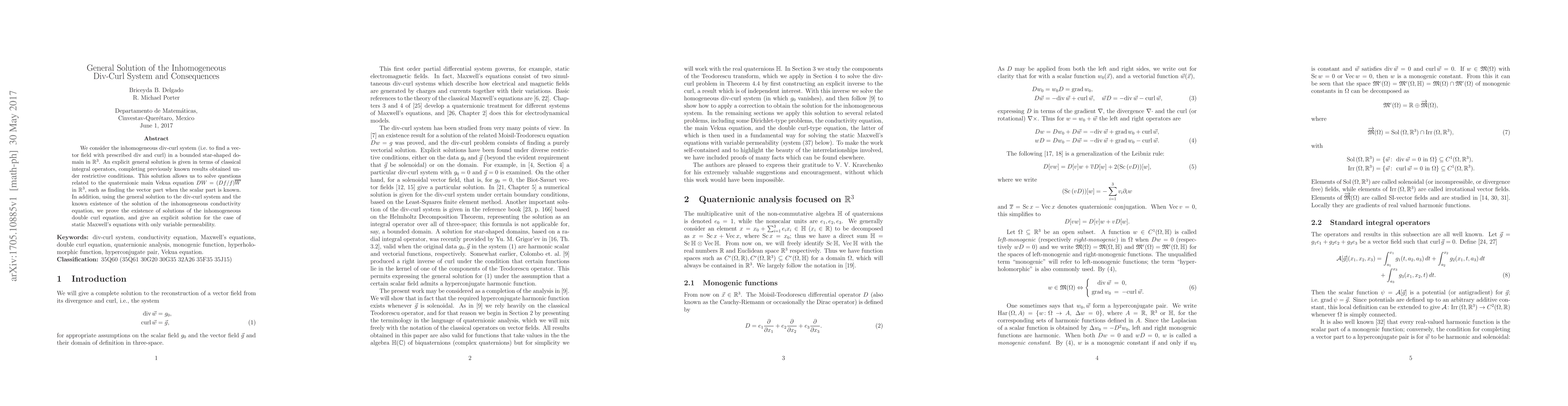 We consider the inhomogeneous div-curl system (i.e.\ to find a vector field with prescribed div and curl) in a bounded star-shaped domain in $\mathbb{R}^3$. An explicit general solution is given in terms of classical integral operators, completing previously known results obtained under restrictive conditions. This solution allows us to solve questions related to the quaternionic main Vekua equation $DW=(Df/f)\overline W$ in $\mathbb{R}^3$, such as finding the vector part when the scalar part is known. In addition, using the general solution to the div-curl system and the known existence of the solution of the inhomogeneous conductivity equation, we prove the existence of solutions of the inhomogeneous double curl equation, and give an explicit solution for the case of static Maxwell's equations with only variable permeability.