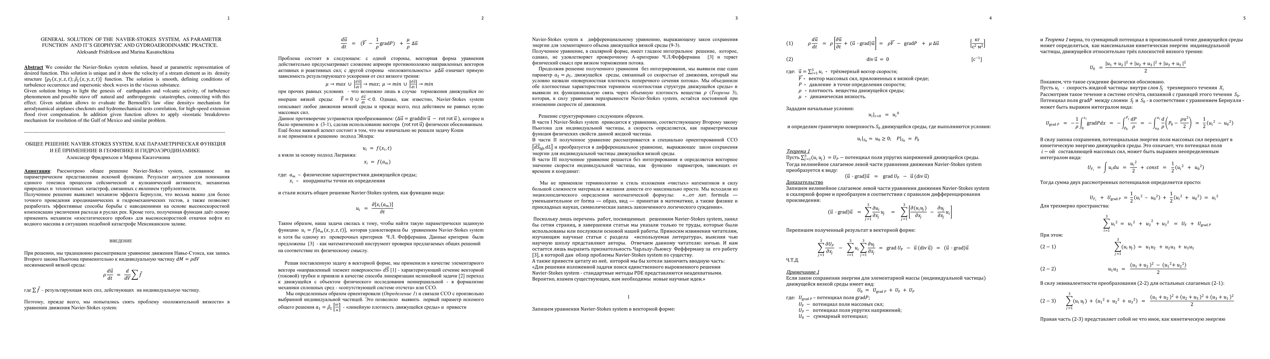 We consider the Navier-Stokes system solution, based at parametric representation of desired function. This solution is unique and it show the velocity of a stream element as its density structure [{\rho}_S (x,y,z,t);{\rho}^\to_L (x,y,z,t)] function. The solution is smooth, defining conditions of turbulence occurrence and supersonic shock waves in the viscous substance. Given solution brings to light the genesis of earthquakes and volcanic activity, of turbulence phenomenon and possible stave off natural and anthropogenic catastrophes, connecting with this effect. Given solution allows to evaluate the Bernoulli's law {\guillemotleft}line density{\guillemotright} mechanism for aerodynamical airplanes checkouts and hydromechanical tests correlation, for high-speed extension flood river compensation. In addition given function allows to apply {\guillemotleft}isostatic breakdown{\guillemotright} mechanism for resolution of the Gulf of Mexico and similar problem.