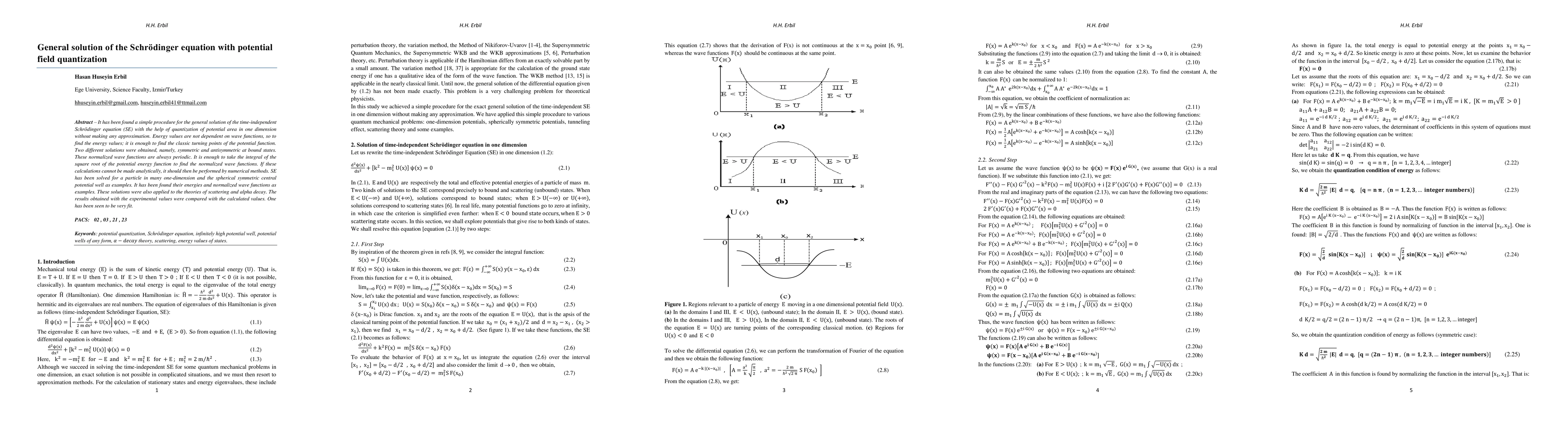 It has been found a simple procedure for the general solution of the time-independent Schr\"odinger equation (SE) with the help of quantization of potential area in one dimension without making any approximation. Energy values are not dependent on wave functions, so to find the energy values; it is enough to find the classic turning points of the potential function. Two different solutions were obtained, namely, symmetric and antisymmetric at bound states. These normalized wave functions are always periodic. It is enough to take the integral of the square root of the potential energy function to find the normalized wave functions. If these calculations cannot be made analytically, it should then be performed by numerical methods. SE has been solved for a particle in many one-dimension and the spherical symmetric central potential well as examples. It has been found their energies and normalized wave functions as examples. These solutions were also applied to the theories of scattering and alpha decay. The results obtained with the experimental values were compared with the calculated values. One has been seen to be very fit.