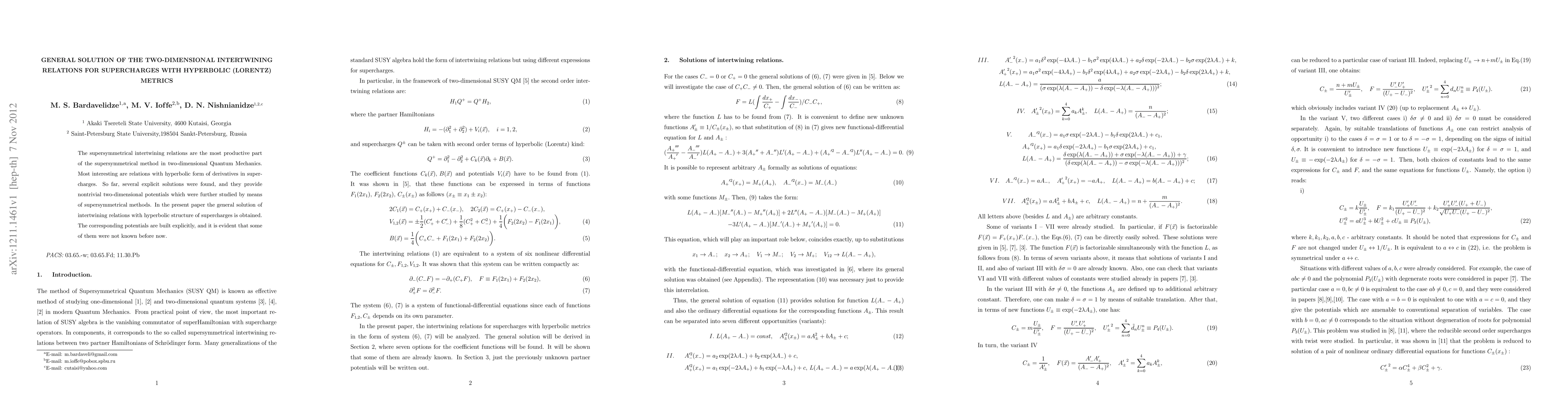 This paper presents the general solution for two-dimensional intertwining relations involving hyperbolic metrics in supercharges, offering previously unknown explicit potentials that are significant for further supersymmetrical studies.