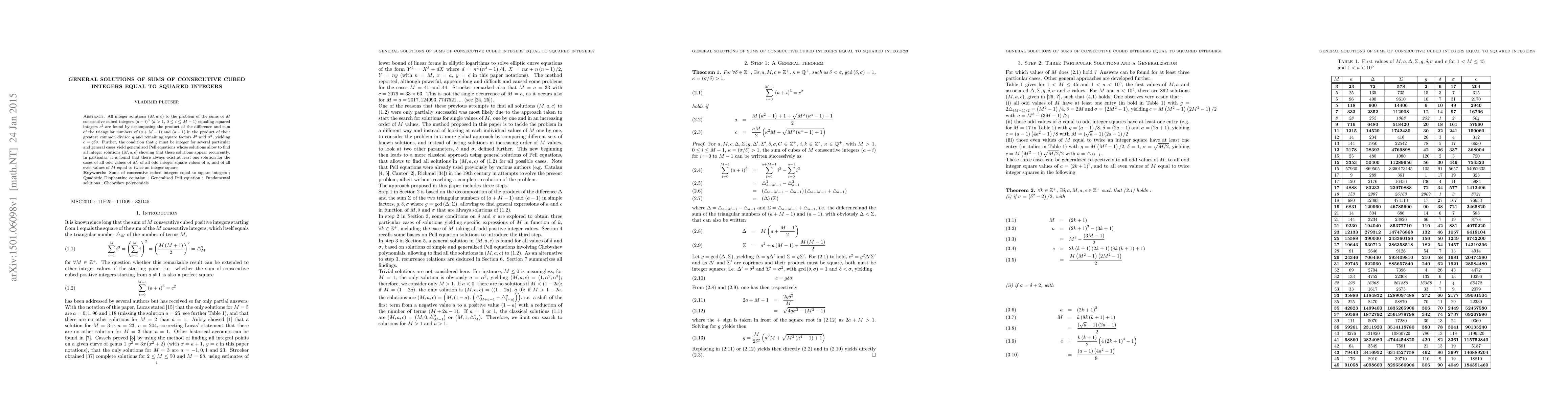 All integer solutions $\left(M,a,c\right)$ to the problem of the sums of $M$ consecutive cubed integers $\left(a+i\right)^{3}$ ($a>1$, $0\leq i\leq M-1$) equaling squared integers $c^{2}$ are found by decomposing the product of the difference and sum of the triangular numbers of $\left(a+M-1\right)$ and $\left(a-1\right)$ in the product of their greatest common divisor $g$ and remaining square factors $\delta^{2}$ and $\sigma^{2}$, yielding $c=g\delta\sigma$. Further, the condition that $g$ must be integer for several particular and general cases yield generalized Pell equations whose solutions allow to find all integer solutions $\left(M,a,c\right)$ showing that these solutions appear recurrently. In particular, it is found that there always exist at least one solution for the cases of all odd values of $M$, of all odd integer square values of $a$, and of all even values of $M$ equal to twice an integer square.