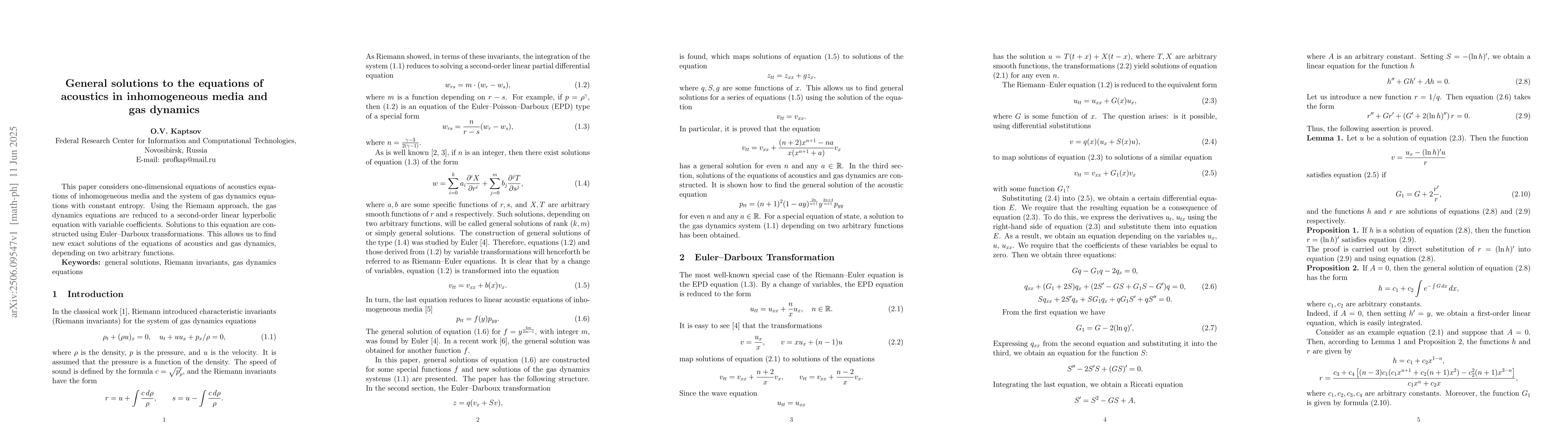 This paper considers one-dimensional equations of acoustics equations of inhomogeneous media and the system of gas dynamics equations with constant entropy. Using the Riemann approach, the gas dynamics equations are reduced to a second-order linear hyperbolic equation with variable coefficients. Solutions to this equation are constructed using Euler transformations. This allows us to find new exact solutions of the equations of acoustics and gas dynamics, depending on two arbitrary functions.