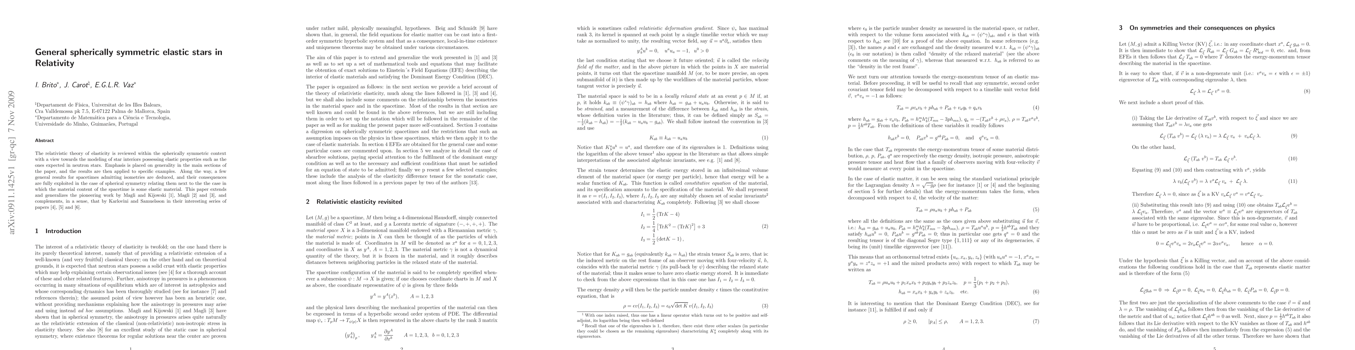 This paper generalizes the relativistic theory of elasticity for spherically symmetric elastic stars, extending previous work by Magli, Kijowski, and Karlovini. It deduces general results for isometric spacetimes and applies them to model neutron stars with elastic properties.