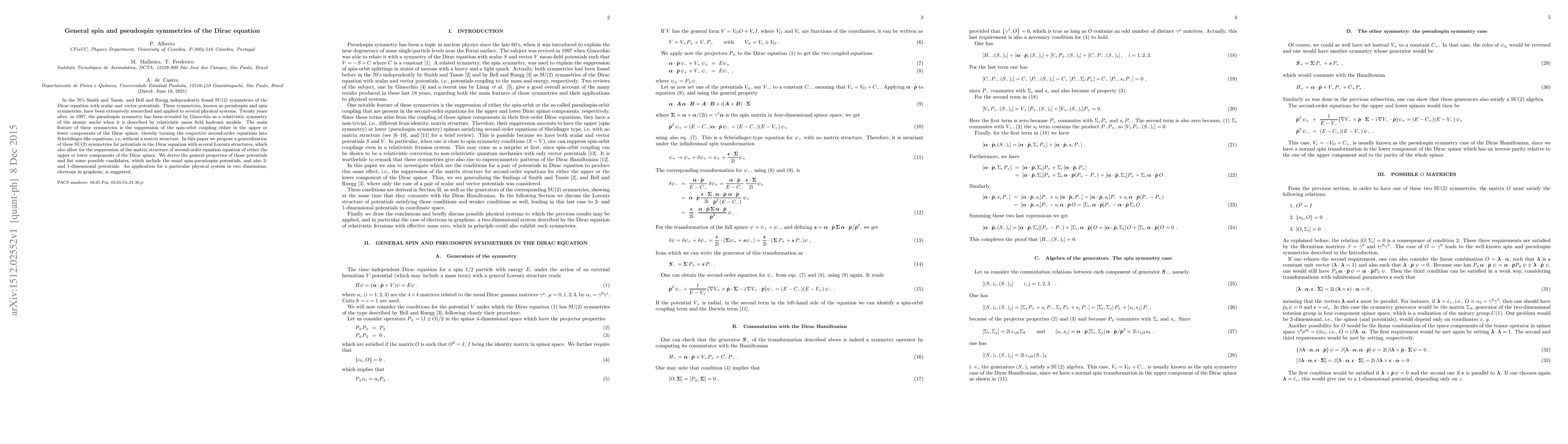 This paper generalizes the SU(2) symmetries of the Dirac equation, including pseudospin and spin symmetries, to a variety of potentials, allowing for the suppression of spin-orbit coupling in the Dirac spinor's components. It proposes new potential candidates and suggests applications, such as electrons in graphene.