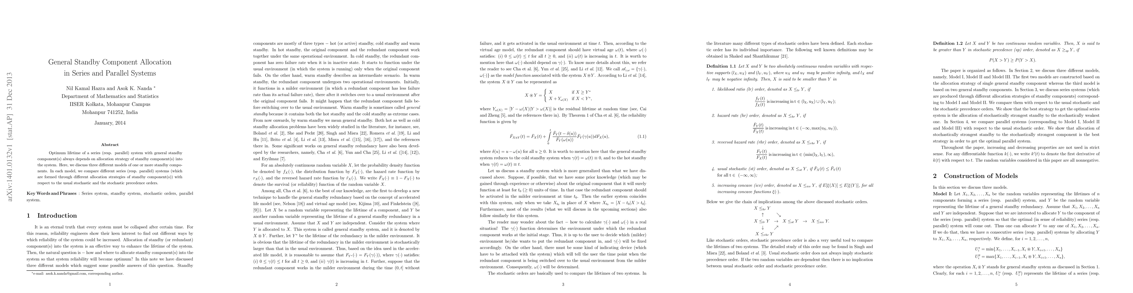 Optimum lifetime of a series (resp. parallel) system with general standby component(s) always depends on allocation strategy of standby component(s) into the system. Here, we discuss three different models of one or more standby compo- nents. In each model, we compare different series (resp. parallel) systems (which are formed through different allocation strategies of standby component(s)) with respect to the usual stochastic and the stochastic precedence orders.