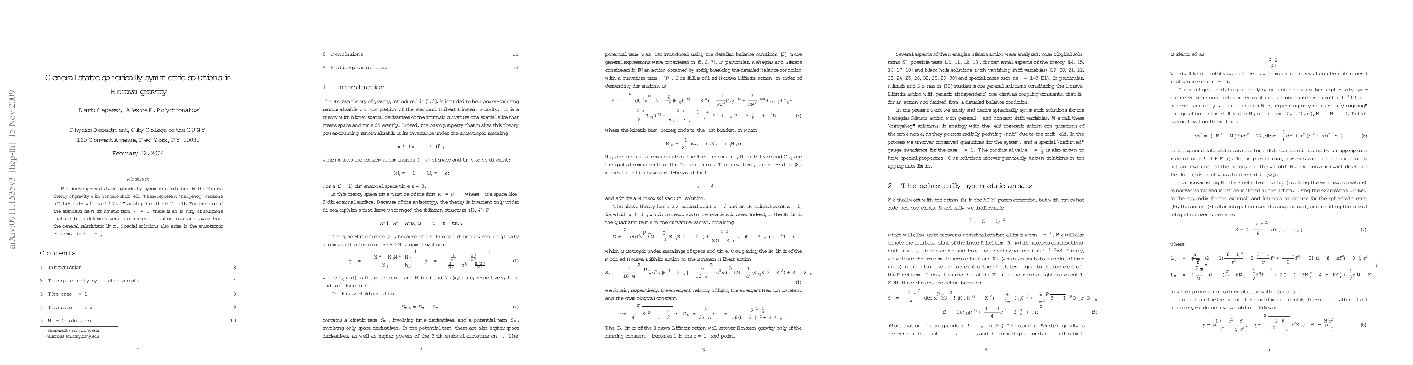This paper derives general static spherically symmetric solutions in Horava gravity featuring a nonzero shift field, presenting "hedgehog" black holes with radial "hair." For lambda = 1, it finds an infinite set of solutions with deformed reparametrization invariance, while lambda = 1/3 yields special anisotropic solutions.
