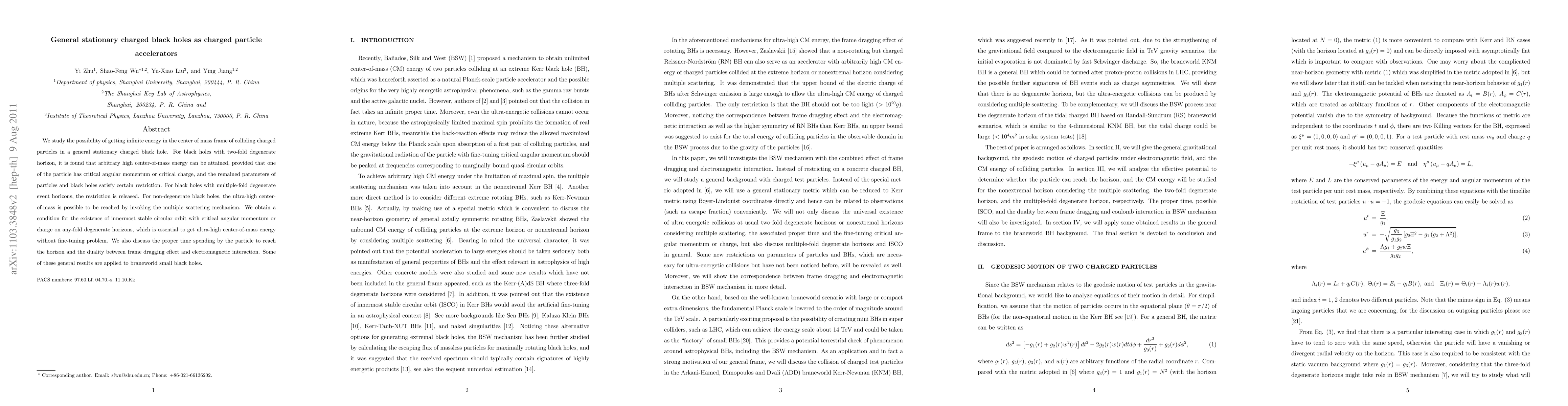 The paper presents a detailed analysis of effective potentials and ISCO conditions for general stationary charged black holes, providing a framework for understanding high-energy particle collisions near black hole horizons.